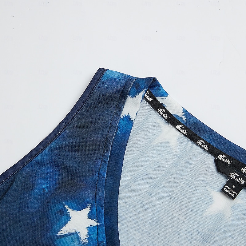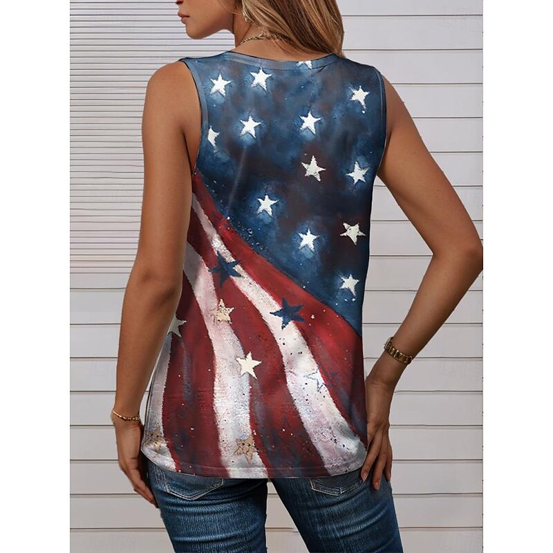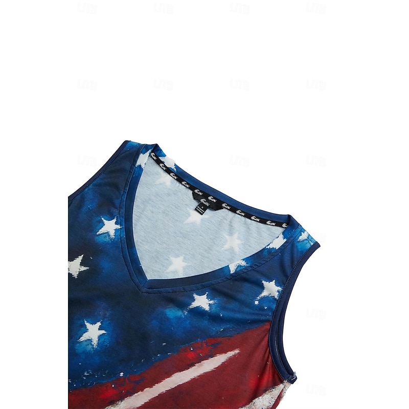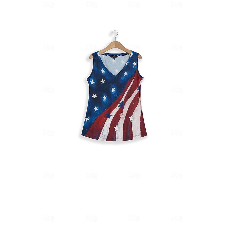 Highlights [Fabric] : Crafted from a lightweight and breathable polyester fabric, this women's tank top offers micro-elasticity for a comfortable and relaxed fit, perfect for summer wear. [Fit] : Featuring a regular fit, this sleeveless V-neck top ensures easy movement and a flattering look, making it a versatile piece for any casual outing. [Design Highlights] : Showcasing a bold design inspired by the American flag, the tank top includes striking stars and stripes in a 3D print, adding a playful touch to your wardrobe and making it ideal for showcasing your patriotic spirit. [Occasions] : Perfect for Independence Day celebrations, Hawaiian-themed parties, and other patriotic events, this tank top allows you to express your style with ease and comfort, pairing seamlessly with jeans or shorts. [Size Range] : Available in sizes S, M, L, XL, and 2XL, this top caters to a wide range of body types, providing a comfortable and chic fit for everyone.