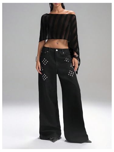 HOT ! MakeMeChic Women's Sheer Poncho Top Striped Asymmetrical Mesh Tops Shrug Sweater