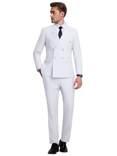 • 2 Piece Suit Set: Double breasted blazer with 2 flap pockets.Regular fit,peaked lapel,four button cuffs.Loose flat front casual pants with elastic waist,zip fly, straight fit,2 side pockets and 2 back button pockets.Mens suit jacket and trousers, classic and fashionable.