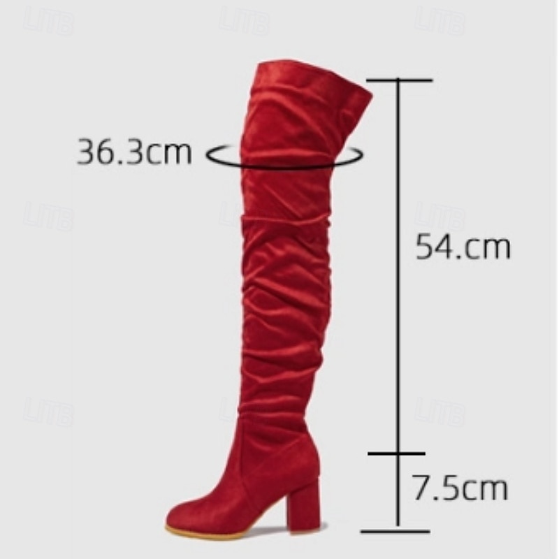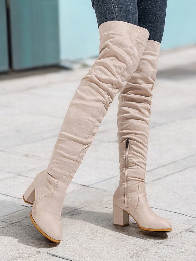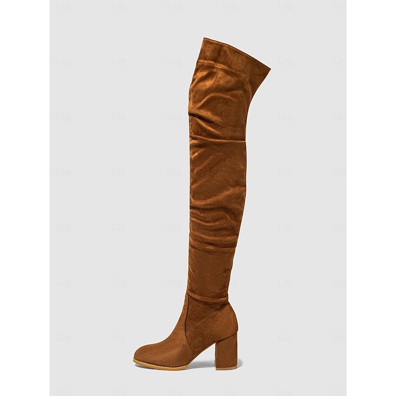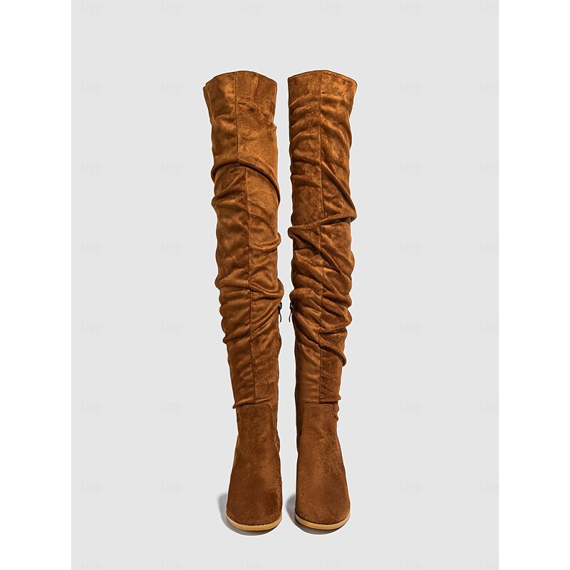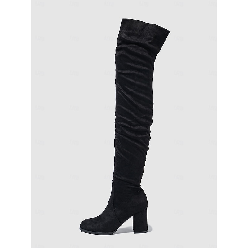 Highlights [Fabric] : Crafted from high-quality faux suede, these women's over-the-knee boots provide a luxurious, soft texture that enhances their elegant and chic appearance. The material is perfect for fall and winter, offering warmth and style. [Fit] : These boots feature a sleek over-the-knee design that adds dramatic flair, making them a standout accessory for any outfit. The chunky heel not only gives height but also ensures stability for comfortable all-day wear. [Design Highlights] : The boots come with a convenient side zipper closure for easy wear and removal, while the trendy slouchy, slightly ruched design adds a modern touch. The round toe shape offers additional comfort and complements the overall sophisticated look. [Occasions] : Ideal for both casual outings and dressier occasions during the cooler months. Whether you're going for a relaxed daytime look or dressing up for a winter evening, these boots pair well with skinny jeans or skirts, adding elegance to any ensemble. [Size Range] : Available in a variety of sizes, from US5.5 to US10, ensuring a perfect fit for a wide range of customers seeking both style and comfort.