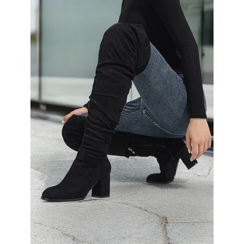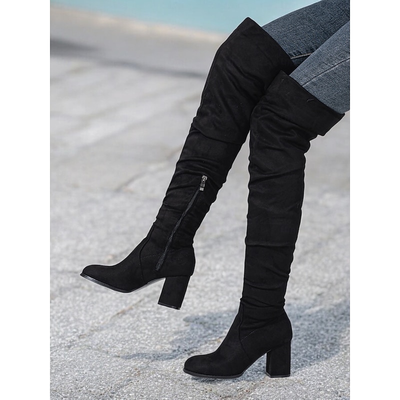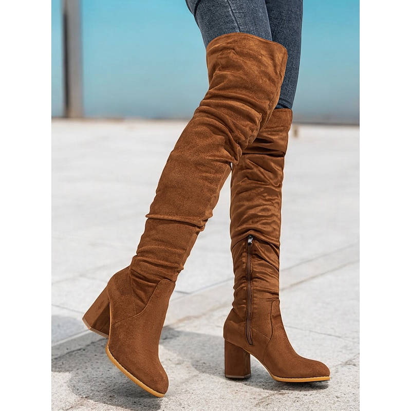 Women's Faux Suede Over-the-Knee Block Heel Boots – Stylish Slouchy Design with Zipper Closure for Winter Fashion 2