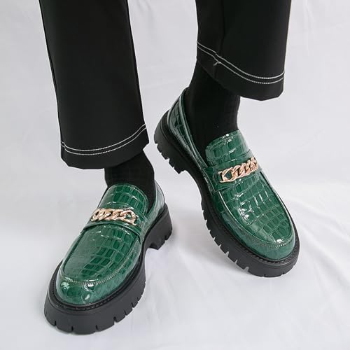 • [Stylish Appearance] These men's loafers feature a patent leather upper for a rich, textured look. Gold chain embellishments add a touch of luxury and style. The classic loafer silhouette, combined with a thick sole, creates a retro yet edgy look, easily adapting to a variety of styles, from business to casual, allowing you to showcase your unique style and personality in any occasion.