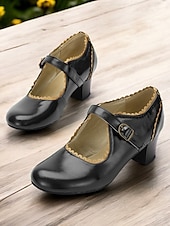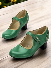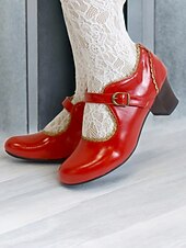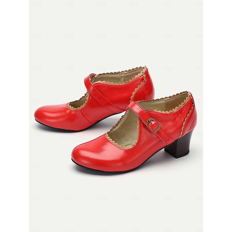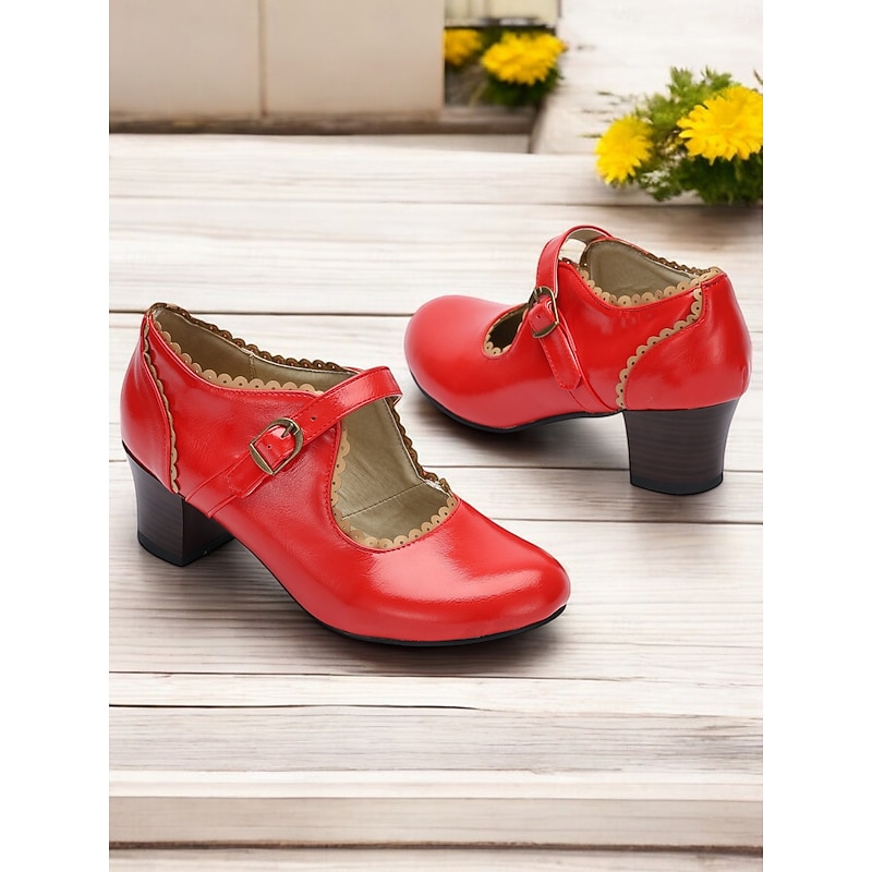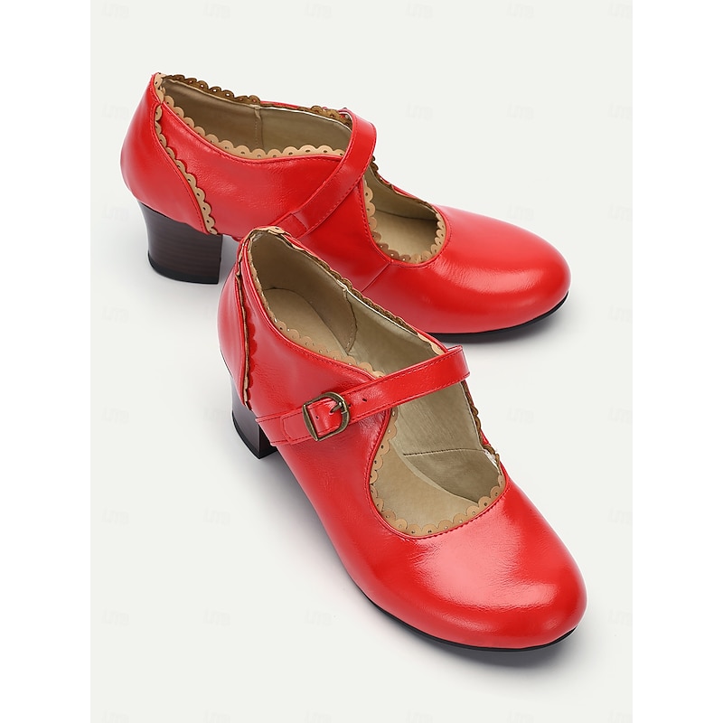 Highlights [Fabric and Style] : These Women's Red Patent Faux Leather Mary Jane Block Heel Shoes are crafted from high-quality PU leather, providing a sleek and polished look. The synthetic leather lining ensures comfort and durability, while the sturdy rubber outsole adds a reliable grip. [Fit and Style] : Featuring a classic Mary Jane design with a single buckle strap across the ankle, these shoes boast a vintage charm with their scalloped trims in contrasting beige. The round toe provides ample room and comfort, and the chunky heel delivers both height and stability, making it suitable for various daily activities. [Design Highlights] : The standout design feature includes adjustable buckle straps that offer a secure fit along with decorative scalloped trim that adds a touch of retro elegance. The color block pattern further elevates the vintage-inspired aesthetic, making these shoes a bold choice for any occasion. [Occasions] : Perfect for a range of settings including daily wear, work environments, and special occasions. These shoes complement a variety of outfits, whether you're aiming for a casual look or dressing up for a formal event, and make a strong fashion statement thanks to their retro Mary Jane style. [Size Notice] : Available in a wide range of sizes from US5 / EU35 / UK3 to US13 / EU43 / UK11, these shoes fit standard sizing, so selecting your usual size is recommended for the best fit. Suitable for all seasons, including spring, summer, fall, and winter.