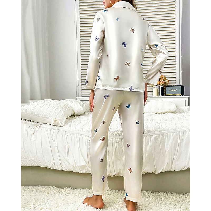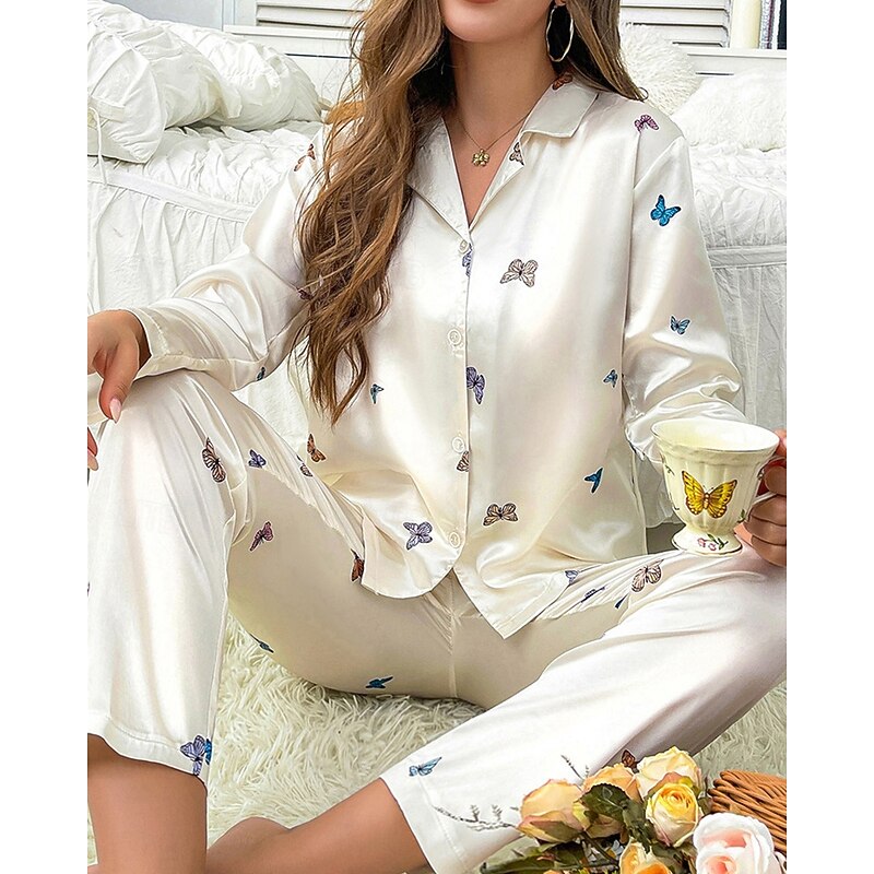 HOT ! Women's Loungewear Pajama Set Casual Comfort Butterfly Elastic Waist Shirt Pant Home Daily Long Sleeve Shirt Collar White Beige Spring Fall Regular Fit