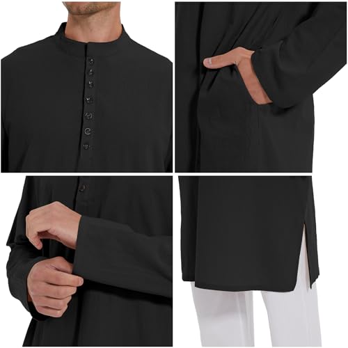 YAOHUOLE Men's Long Sleeve Muslim Thobe Robe Button Up Kaftan With Side Split and Pockets 3
