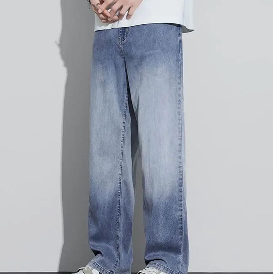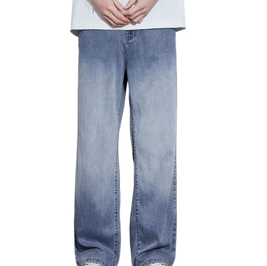 HOT ! Men’S Straight Jeans Mid Waist Loose Fit Casual Pants Lightweight Gradient Wash with Button Jeans