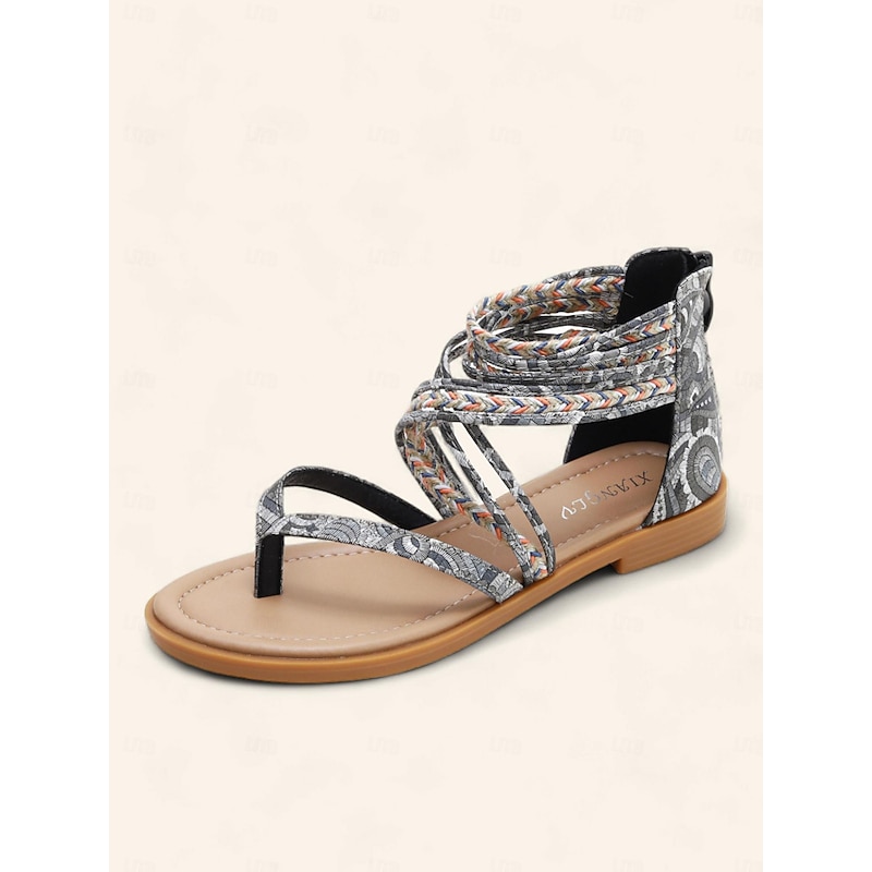 Highlights [Fabric] Crafted from high-quality PU, these women's flat sandals ensure durability and a smooth feel, perfect for summer wear. The vibrant woven pattern adds a bohemian touch, making these sandals a standout piece in your summer collection. [Fit] Designed with a flat heel, these sandals offer comfort and ease for all-day wear, ideal for casual and beach settings. [Design Highlights] Featuring an intricately braided design, these sandals boast multiple ankle straps that elegantly wrap around the leg for both style and support. The buckle closure adds convenience, while the minimalist open-toe design offers breathability and a chic appearance. [Occasions] Perfect for daily wear or beach outings, these boho-inspired sandals suit various occasions, from casual get-togethers to summer adventures, ensuring both comfort and style. [Size Range] Available in sizes US6 to US12, these sandals cater to a wide range of foot sizes, ensuring a perfect fit for anyone looking to enhance their summer wardrobe with a touch of bohemian charm. Perfect for everyday use. superior materials and excellent craftsmanship ensure long-lasting durability.