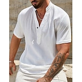 More information about Men's Shirt Linen Shirt Popover Shirt Summer Shirt Beach Wear Henley Shirt Solid Color Vacation Dailywear White Sky Blue Short Sleeve Stand Collar Summer Spring Clothing Apparel