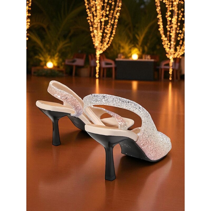 Women's Glitter Slingback Stiletto Sandals - Square Toe High Heels with Rhinestone Ankle Strap for Nightlife Parties and Evening Events 1