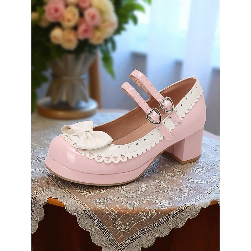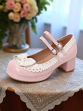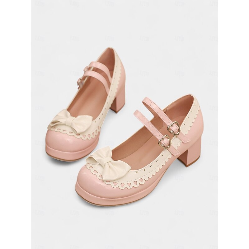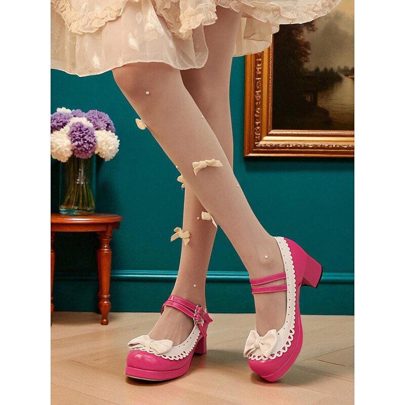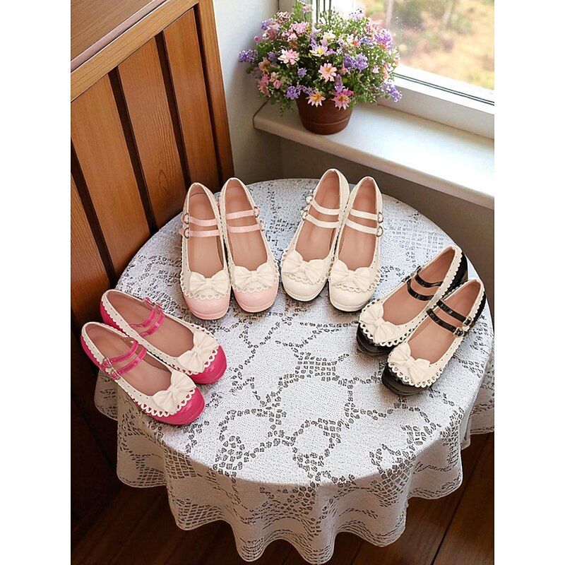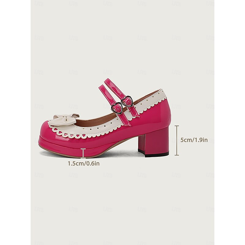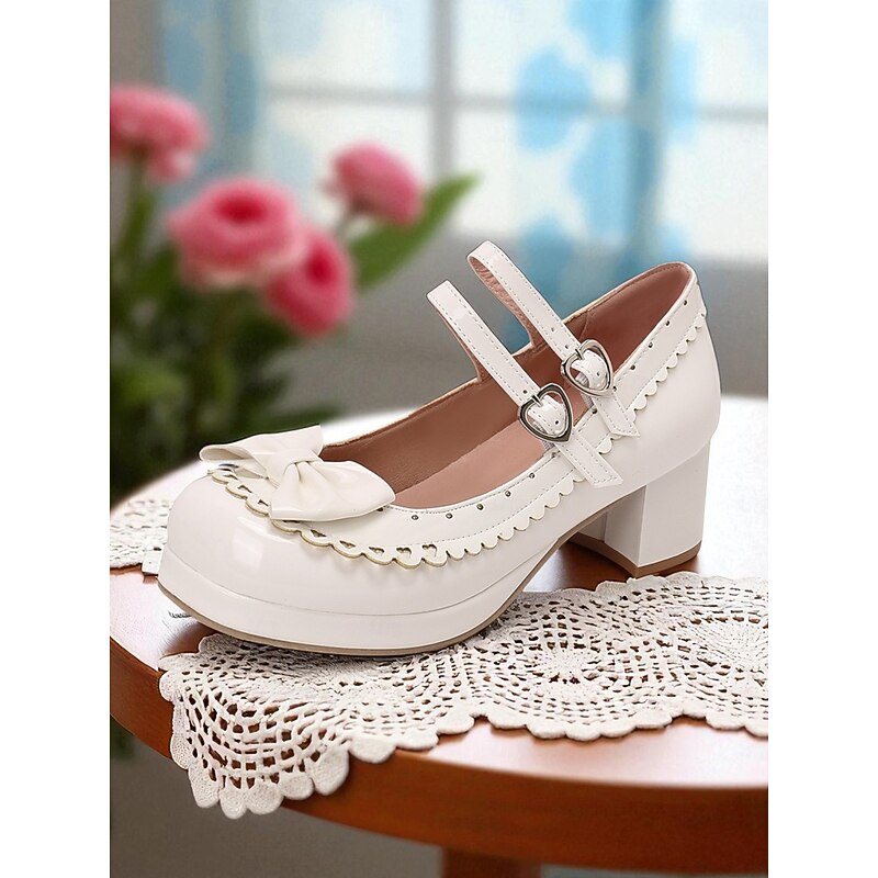 HOT ! Women's 1950s Black and White Faux Patent Bow Mary Jane Shoes – Double Strap Lolita Vintage Chunky Heel Pumps for Girls' Tea Party, School Uniform, and Cosplay Outfits