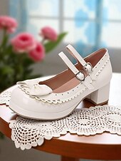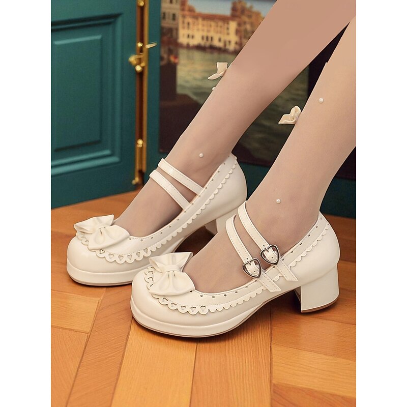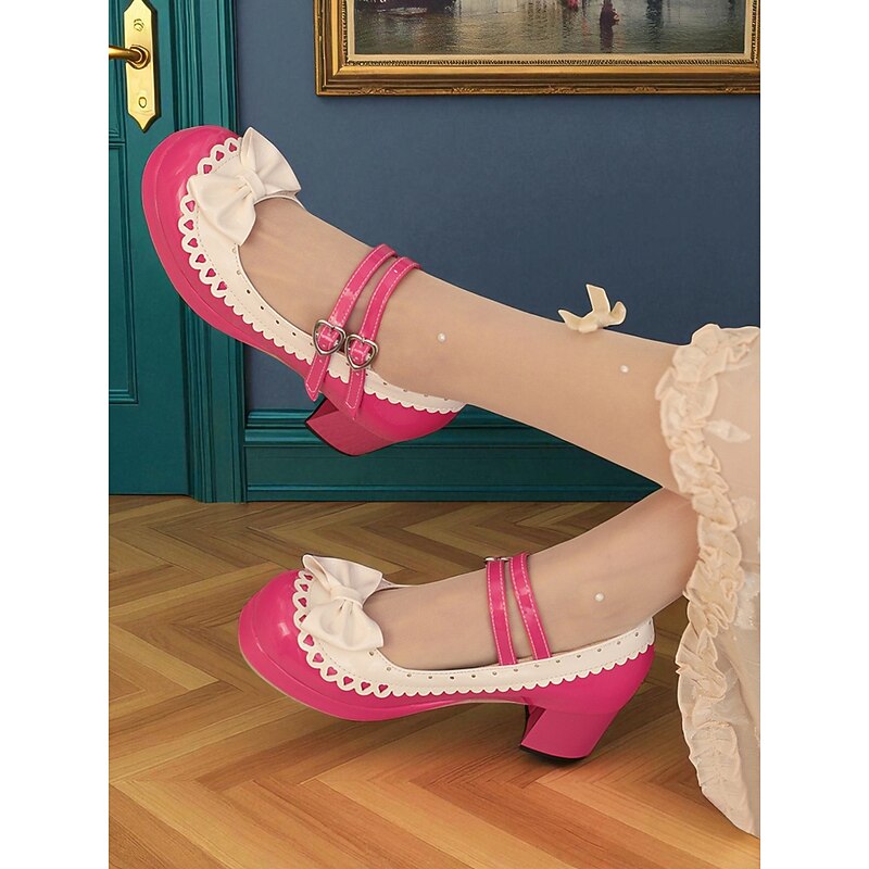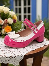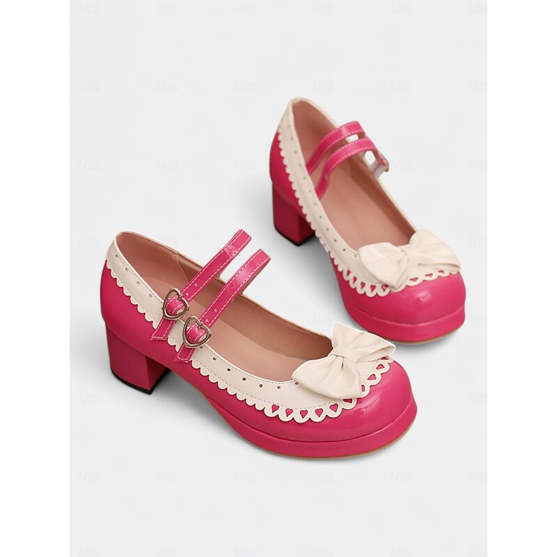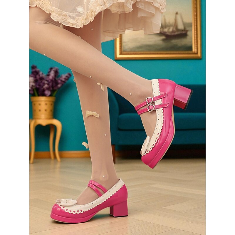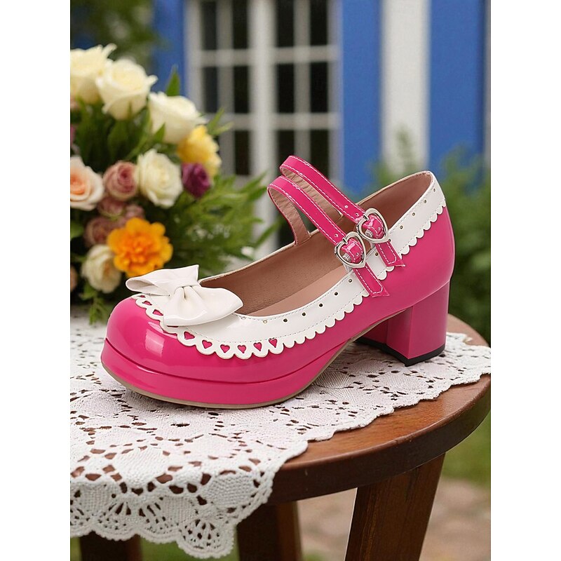 HOT ! Women's 1950s Black and White Faux Patent Bow Mary Jane Shoes – Double Strap Lolita Vintage Chunky Heel Pumps for Girls' Tea Party, School Uniform, and Cosplay Outfits