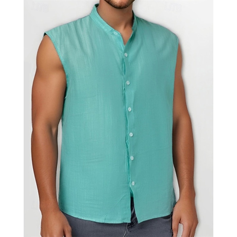 Men's Shirt Summer Shirt Casual Shirt Beach Shirt Button Up Shirt Black Light Green Pink Red Green Sleeveless Plain Band Collar Vacation Hawaiian Clothing Apparel Polyester Fashion Casual Comfortable 7