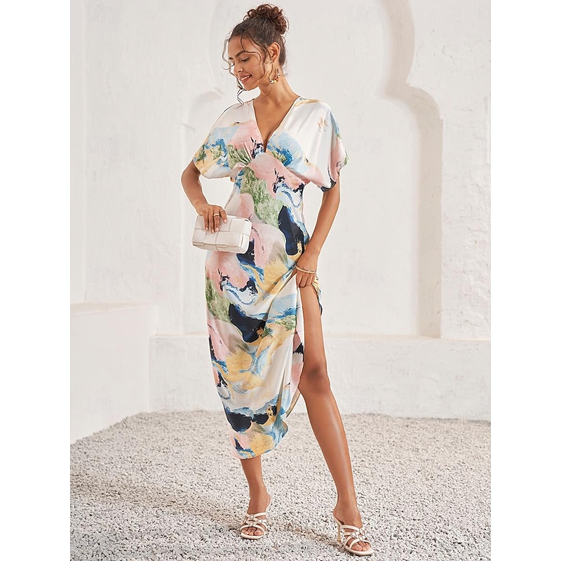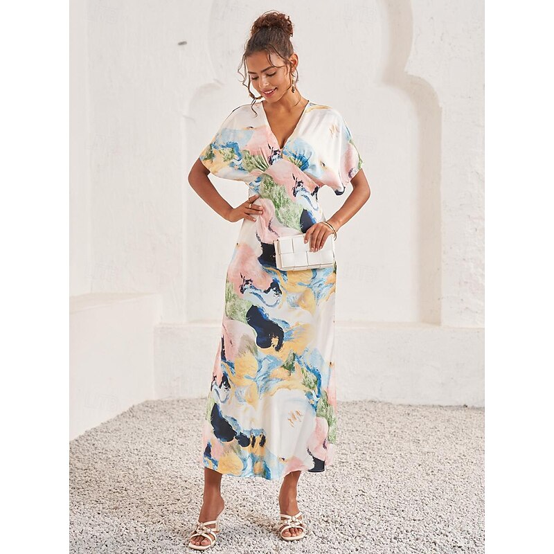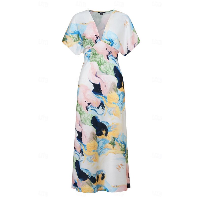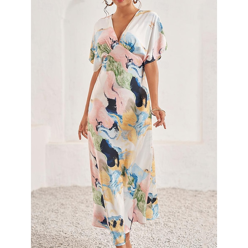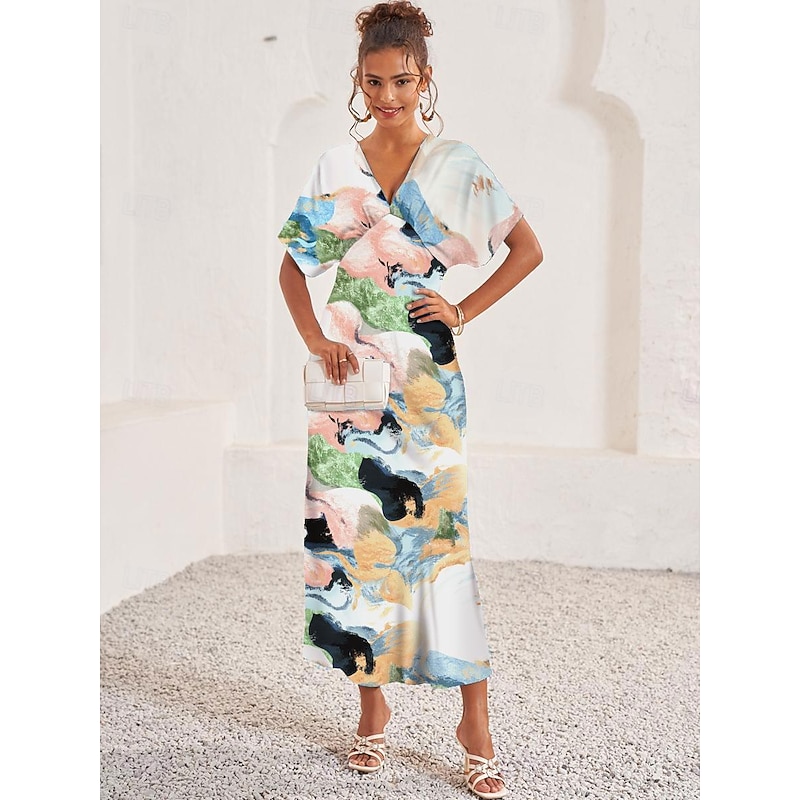 HOT ! Women's Wedding Guest Dress Elegant Tie Dye Maxi Dress Short Sleeve V Neck Print Loose Fit Daily White Blue Purple Summer Dress