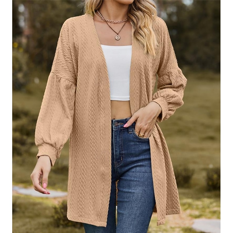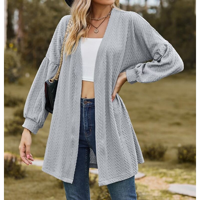 Highlights [Fabric] This outerwear is crafted from high-quality polyester, ensuring a windproof and breathable experience. The knit fabric provides warmth and is perfect for layering, making it suitable for any season. [Fit] Designed with a relaxed, loose fit, this cardigan provides comfort and ease of movement. Its regular length is ideal for everyday wear, offering versatility in styling. [Design Highlights] The cardigan features a collarless, open front design, adding a modern touch to your look. The subtle texture detailing on the long sleeves and the patchwork pattern create a unique, stylish appearance. [Occasions] Perfect for daily wear and vacations, this cardigan is a versatile piece that can easily complement both casual and polished ensembles. Its soft green color brings a fresh and calming vibe to any outfit, making it suitable for various occasions and settings. [Size Range] Available in sizes S, M, L, XL, and XXL, ensuring a comfortable fit for a range of body types.