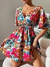 More information about Women's Mini Dress Casual Dress Summer Dress Fashion Outdoor Party Holiday Regular Fit Flower Short Sleeve V Neck Red Summer