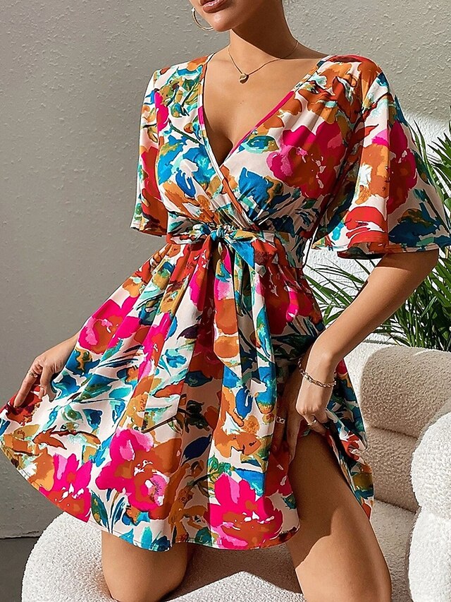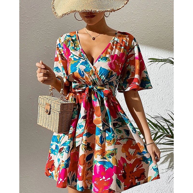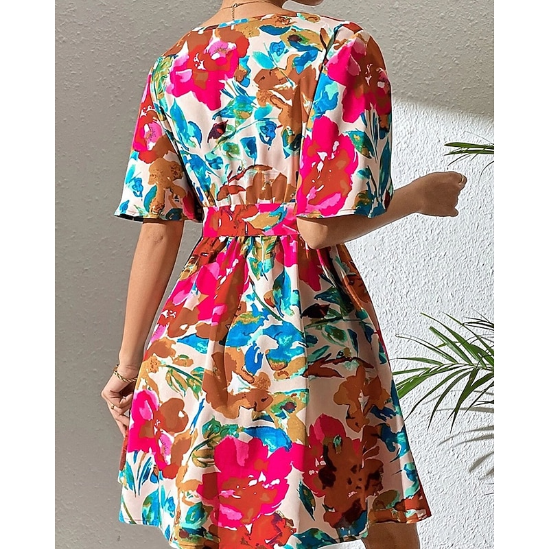 Women's Mini Dress Casual Dress Summer Dress Fashion Outdoor Party Holiday Regular Fit Flower Short Sleeve V Neck Red Summer 7