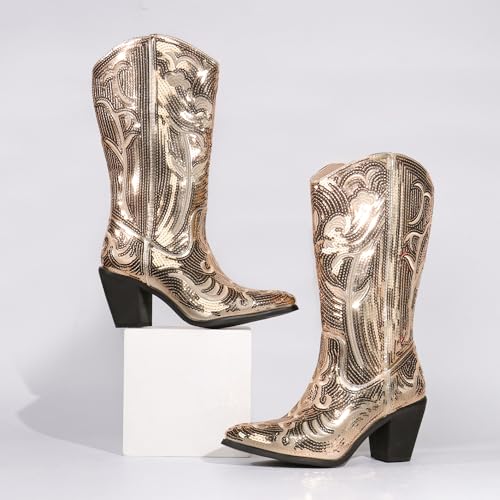 Hawkwell Women's Sequin Mid Calf Western Cowboy Boots Wide Calf High Fashion Zipper Pointed Toe Embroidered Tall Cowgirl Boots