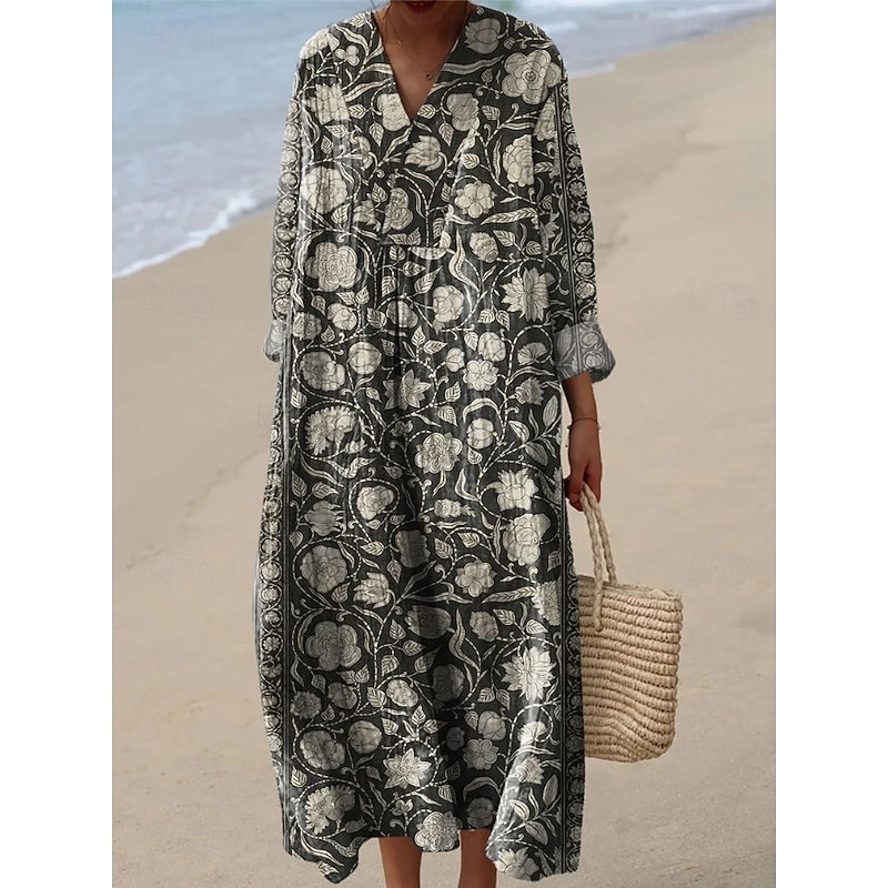 More information about Women's Midi Dress V Neck Long Sleeve Kaftan Lightweight Loose Fit A Line Dress Casual Boho Party Going out Floral Graphic Long Sleeve V Neck Black Pink Red Purple