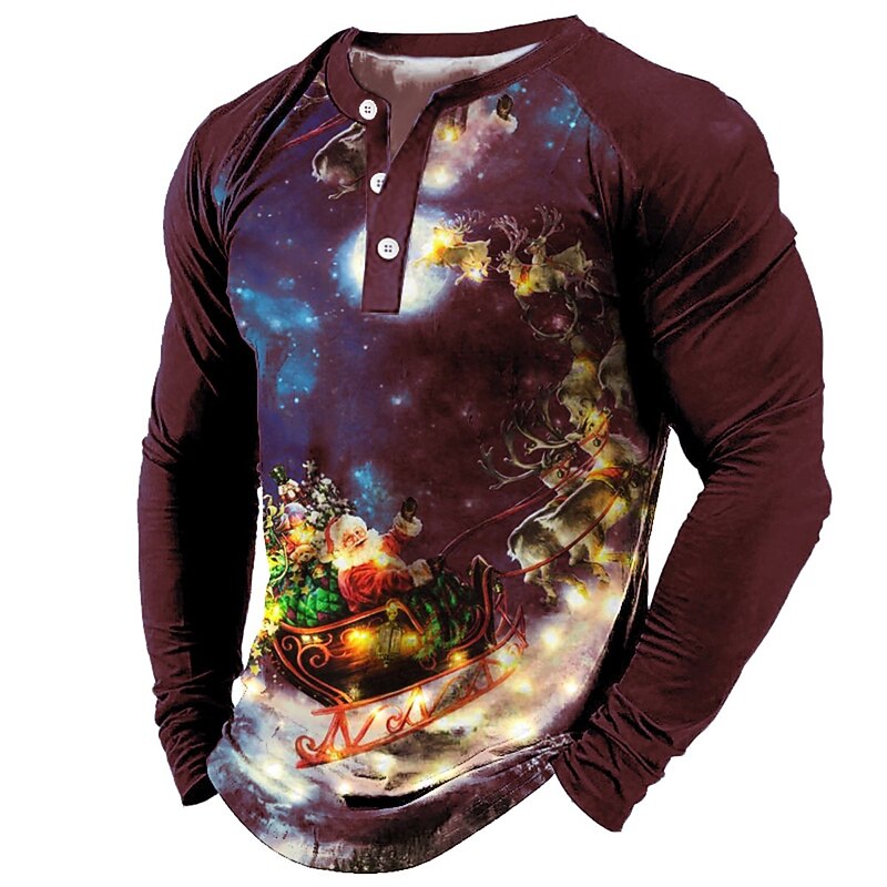 Christmas Men's Santa Claus Henley T Shirt Henley Tee Tee Graphic Santa Claus Henley Sea Blue Green Black Blue Purple 3D Print Outdoor Long Sleeve Patchwork Button-Down Clothing Apparel Basic 12