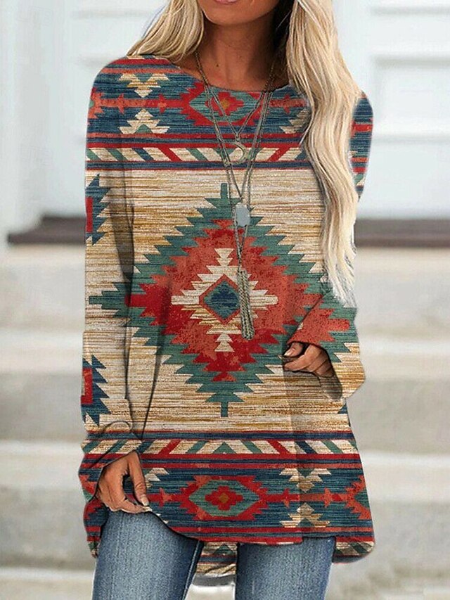 More information about Women's T shirt Long Sleeve Graphic Geometric Vintage Stylish Classic Long Sleeve Crew Neck Round Neck Regular Tops Daily Print Red Orange Green Khaki Spring Fall Prefall
