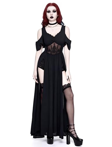 HOT ! LANSHULAN Women Goth Embroidered Hollow Pattern Deep V-Neck Off Shoulder High Slit Halloween Dress