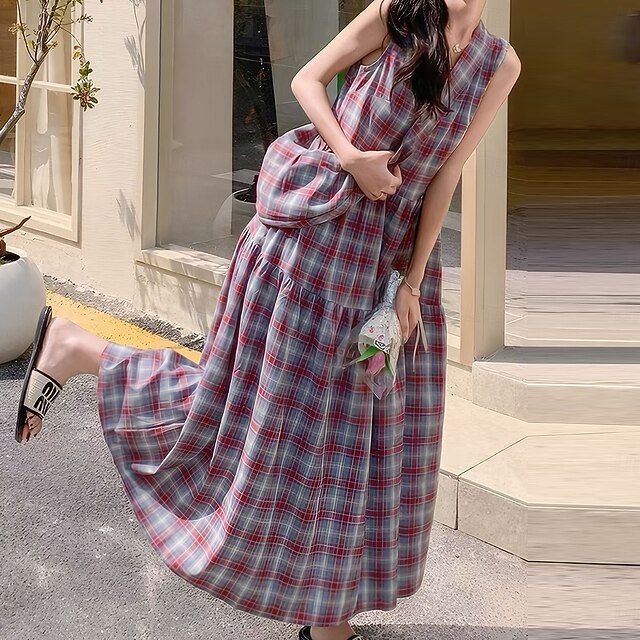 More information about Women's Long Dress Maxi Dress Plaid Dress Classic Daily Regular Fit Plaid Sleeveless Crew Neck Red Summer