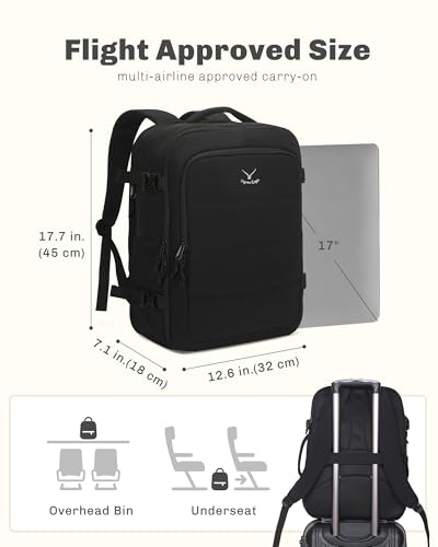 • Flight-Approved Carry-On, this travel backpack is designed to meet most airline size requirements for carry on luggage, measuring 17.7 x 12.6 x 7.1 in. (45 x 32 x 18 cm) and easily fitting in overhead bins or under seats. Its 30L spacious main compartment opens 180° to organize 2-3 days of clothing, secured by internal compression straps. A dedicated back zip compartment for up to 17-inch laptops offers protection during transit.