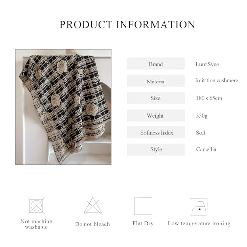 • EXQUISITE DESIGN: The scarf features camellia elements, aesthetic and romantic, interpreting exquisite femininity. The two-color stripes are staggered and spliced, presenting a chic and elegant charm. Low saturation colors, soft and retro, gentle you throughout the autumn and winter. The double-sided pattern is reversible, showing the texture. Short tassels embellish the delicate details and dynamic beauty.
