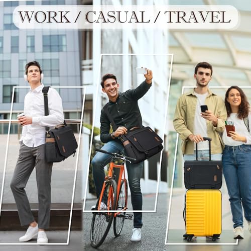 Durable Retro Men's Messenger Bag: This messenger bag is made of wear-resistant waterproof canvas, it'll keep your laptop and other stuffs from rain & snow; All the zippers are solid and smooth; Reinforced stitching seams can be used for a longer time, not easy crack. Our messenger bag is both durable and trendy, it is designed with contrasting antique bronze accessories, and brown leather, conveying a chic retro fashion look and classic fee, perfect for people in college, business and workPlenty Room for Organizing: RAINSMORE laptop messenger bag is perfectly designed with various practical pockets. Front : 2 x Zipper pockets on the flap; 1 x Zipper pocket under the flap: 6 x ID holders; 2 x Deep holders; 2 x Pen holders.Side: 2 x Side pockets. Inner: 1 x Main compartment, 1 x Padded compartment for a 17-inch laptop + an ipad; 2 x Inner open pouch; 1 x inner wall zipper pocket; Back: 1 x Rear zipper pocketRemovable and Adjustable Shoulder Strap: The canvas messenger bag is equipped with an adjustable shoulder strap with shoulder pads, which is comfortable to carry, and the messenger bag can be used as a briefcase. In addition to the two ways of carrying it on one shoulder and crossbody, you can also remove the shoulder strap and carry it using the leather padded handle that can relieve your hand fatigueConvenient Buckle & Padded Laptop Sleeve: The laptop messenger bag is double-fastened by buckles and zippers. The buckles of this laptop bag is adjustable. It is easy to close the buckes even you have a large volume of items in the bag. The padded laptop sleeve fits most laptops up to 17 inches, and the sticky seal ensures it stays stable.Multi-purpose Laptop Bag: The external dimension of this briefcase is 17.3L * 5.9W * 12.59H. Laptop sleeve dimension: 17.3L * 9.5W. Easily store up to17.3 inch laptops. It's a stylish college satchel bag,waterproof men's messenger bag for work,decent business laptop briefcase,large capacity shoulder bags for men.This laptop bag is also a great Valentine's Day Father's Day Thanksgiving Christmas Birthday gift Perfect for everyday use. top-grade materials and excellent craftsmanship ensure long-lasting durability.