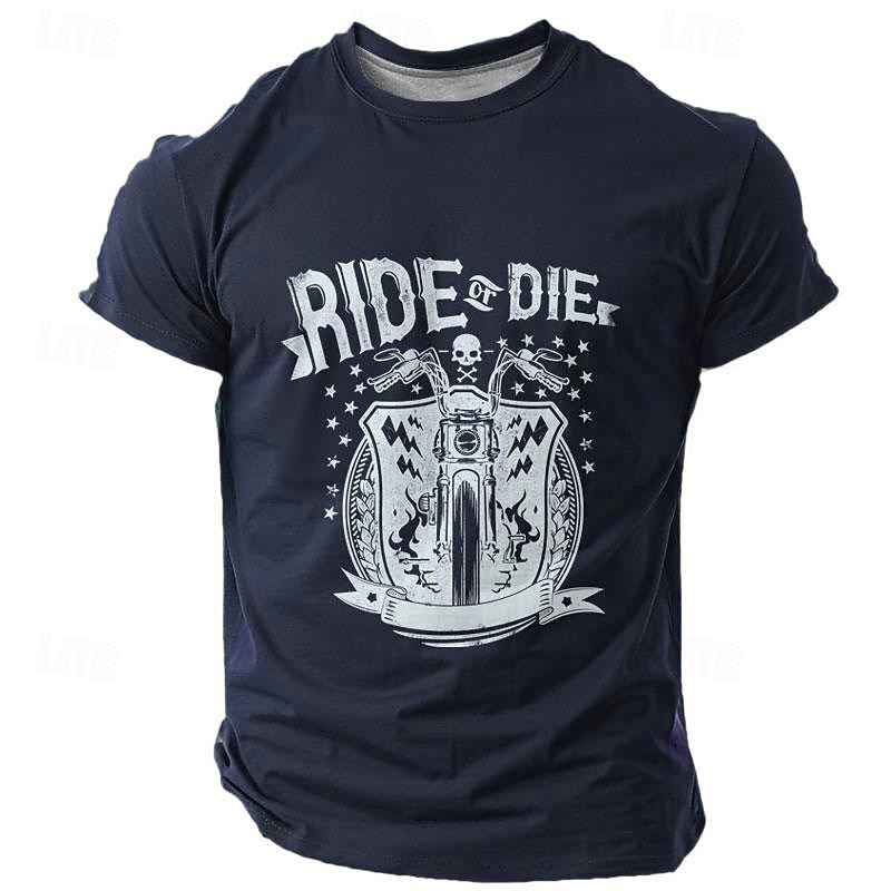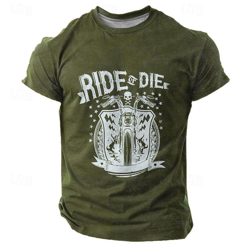 Highlights [Fabric] : Crafted from high-quality polyester, this men's t-shirt offers a micro-elastic texture, ensuring a comfortable and breathable fit perfect for warmer seasons like spring and summer. [Fit] : The t-shirt is tailored with a classic crew neck and tailored fit, providing a balanced silhouette that combines both style and comfort. [Design Highlights] : Featuring a bold graphic print with the words "Ride or Die," this t-shirt is designed for motorcycle enthusiasts and vintage culture fans. The motif of a motorcycle along with decorative elements adds an edgy, rugged appeal suitable for any casual outing. [Occasions] : Perfect for street outings, holidays, or vacation settings, this versatile t-shirt suits casual and relaxed events. Whether you're exploring urban streets or enjoying a laid-back day out, this shirt adds a cool and vintage vibe to your ensemble. [Size Range] : Available in a wide array of sizes, from S to XXXL, to accommodate a broad range of body types, ensuring a comfortable and ideal fit for all.