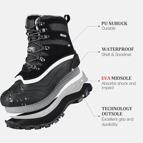 • HIGH-REBOUND EVA+ MD MIDSOLE:These men's snow boots are ergonomically designed for a comfortable fit as if they were tailor-made; the high elasticity EVA MD midsole combined with the high elasticity insole effectively absorbs shock and reduces the burden on the feet; the excellent wrapping combined with the breathable technology ensures that your feet are dry and not stuffy