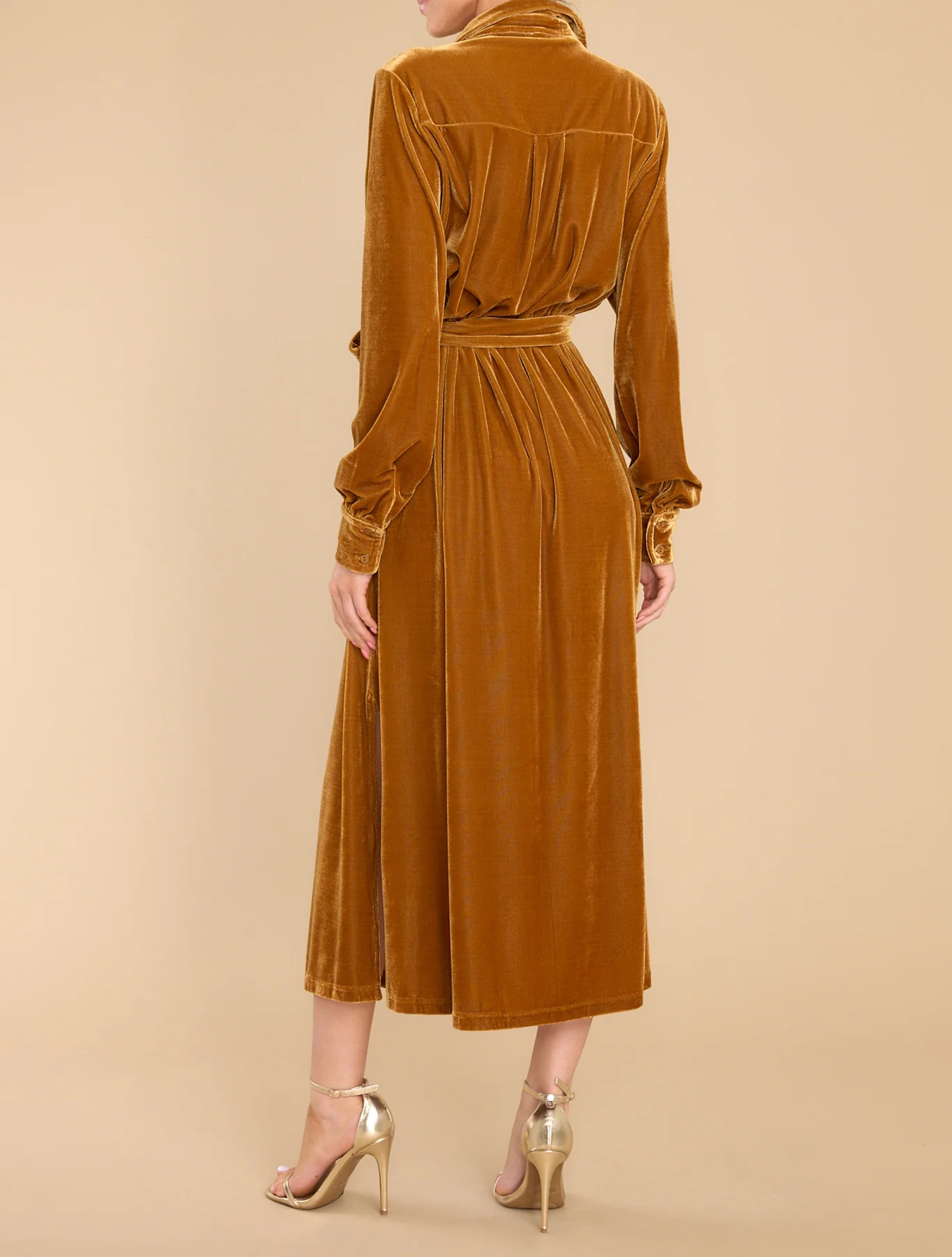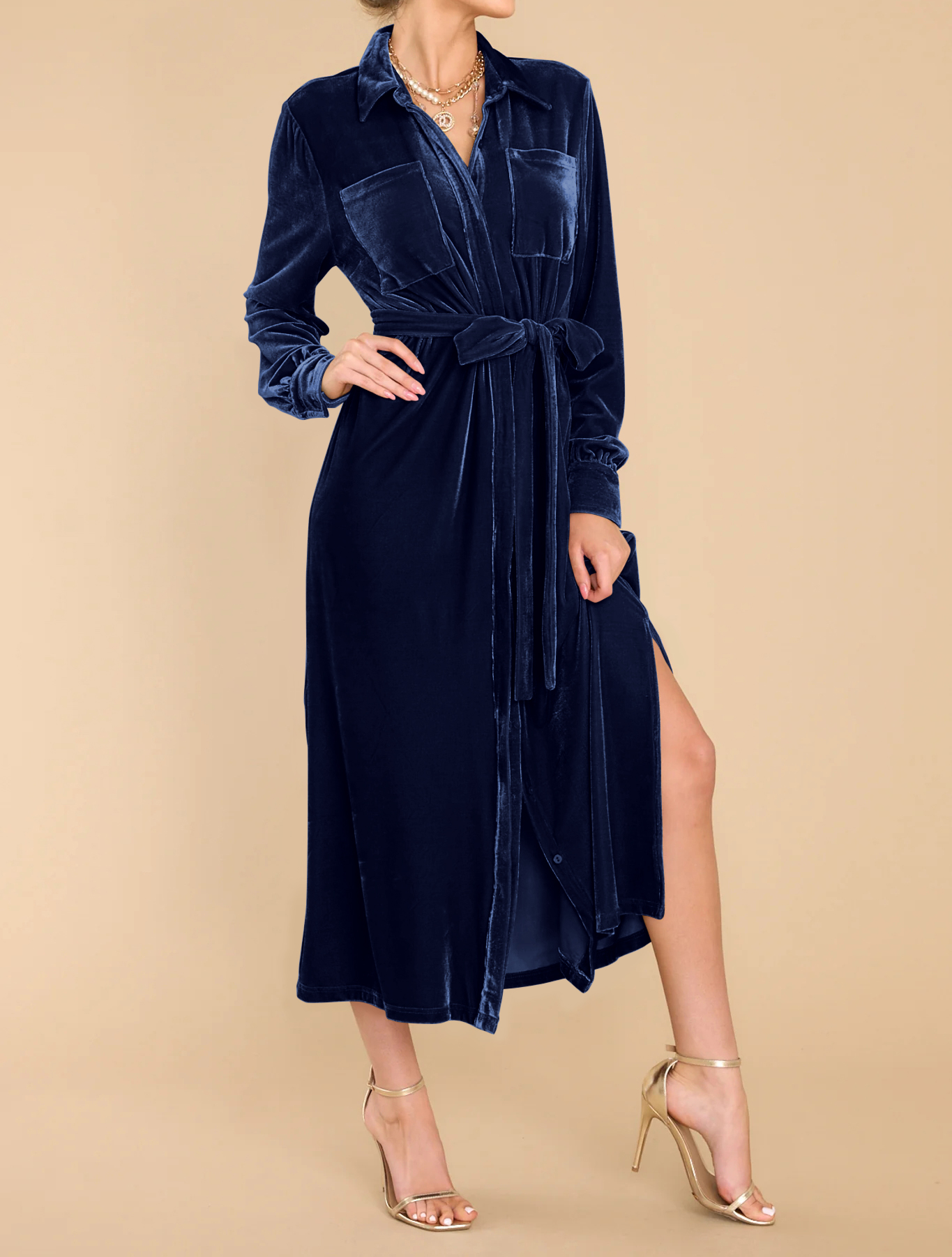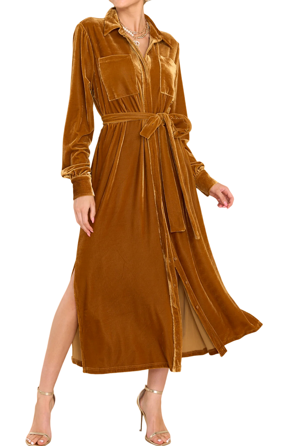 R.Vivimos Women's Fall Long Sleeve Velvet Casual Dresses Button Down Loose Slit Shirt Midi Dress with Belt 4