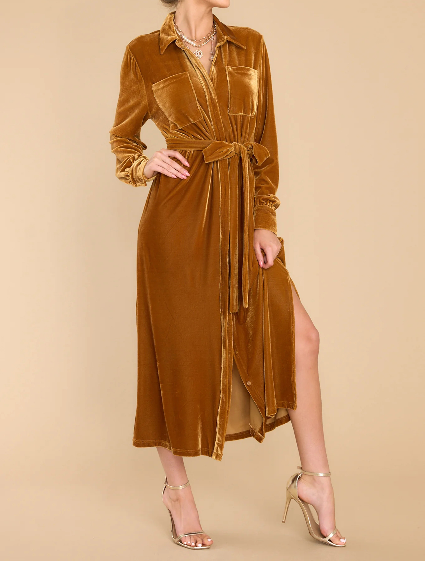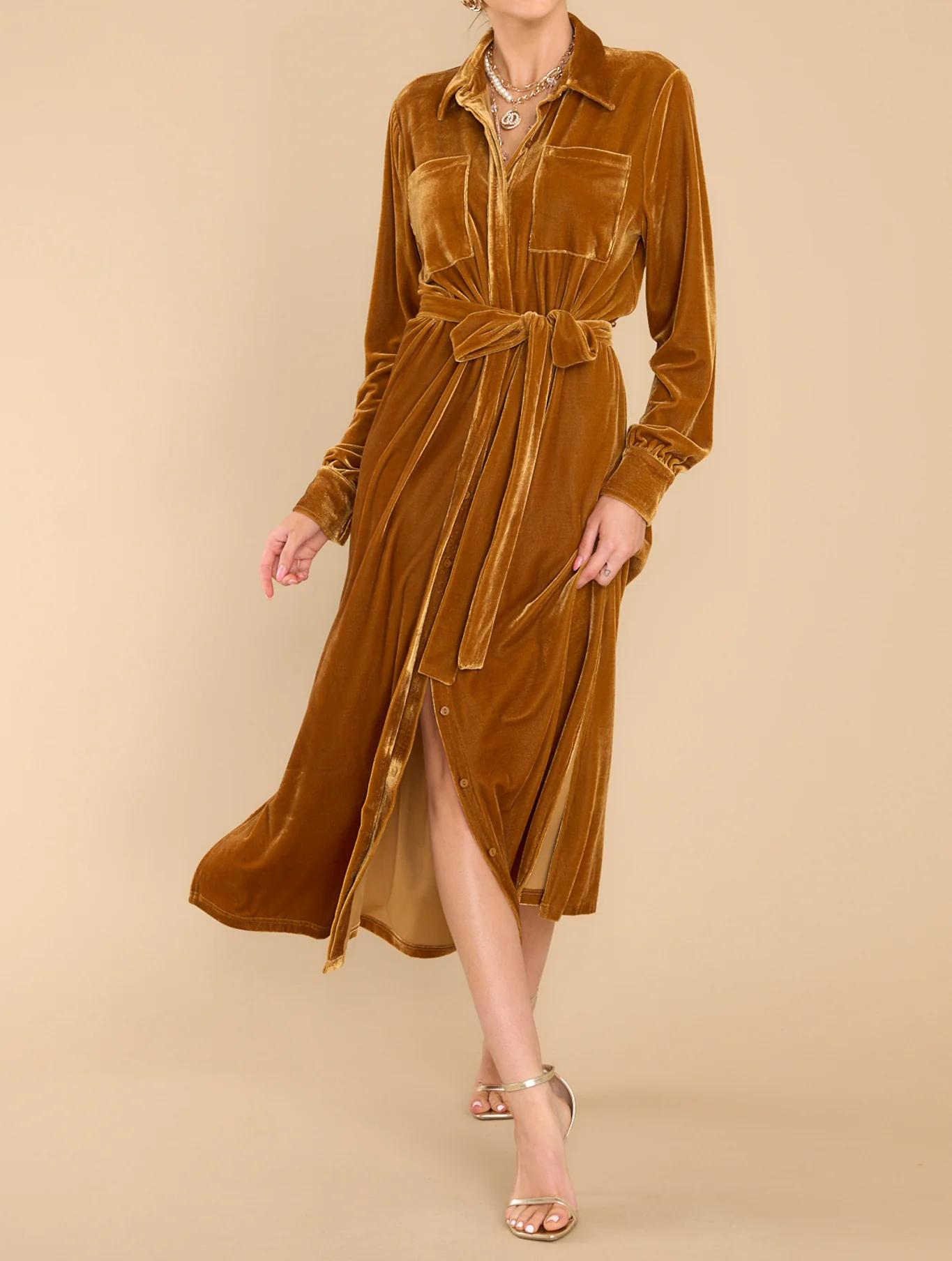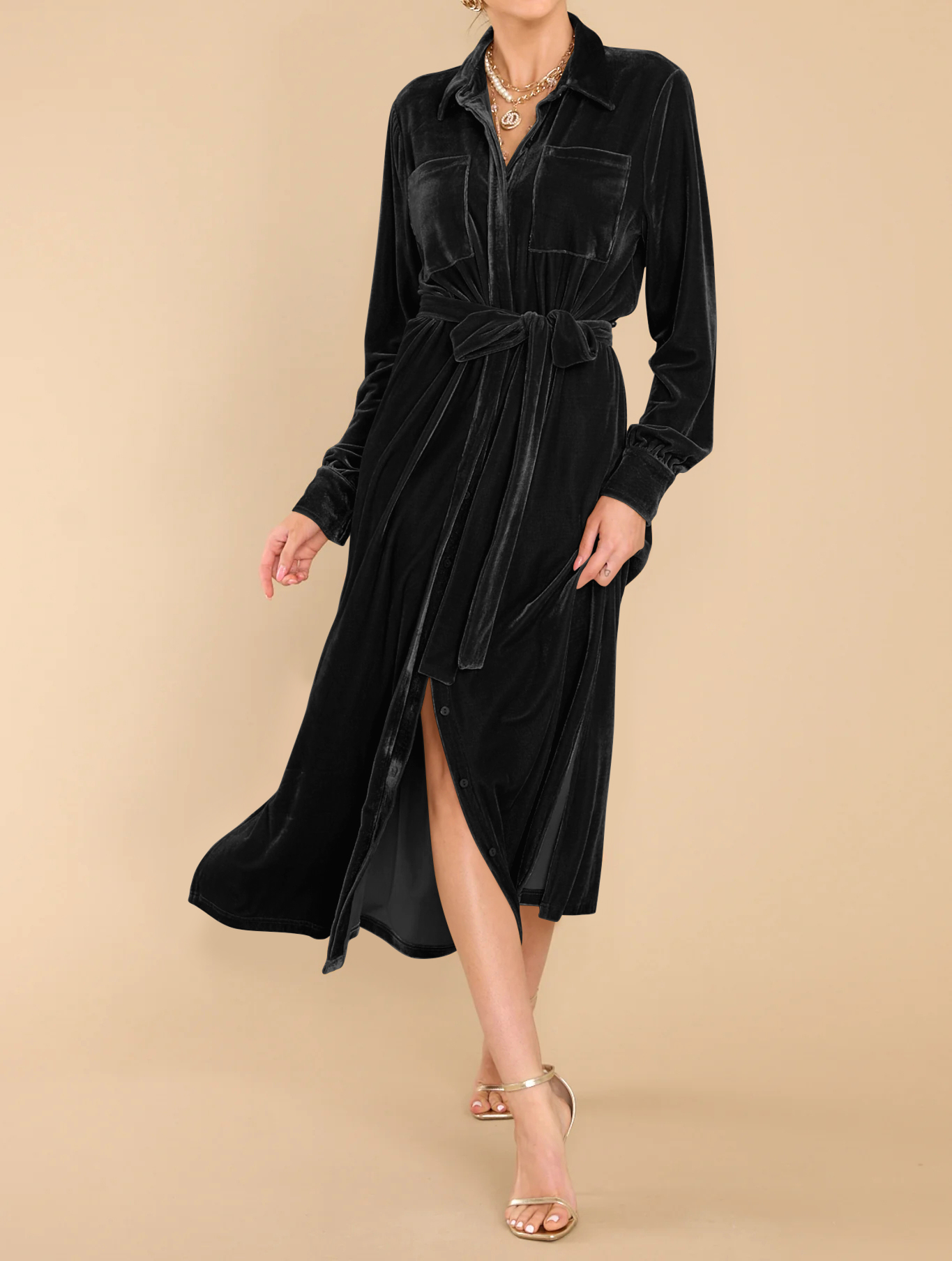R.Vivimos Women's Fall Long Sleeve Velvet Casual Dresses Button Down Loose Slit Shirt Midi Dress with Belt 9