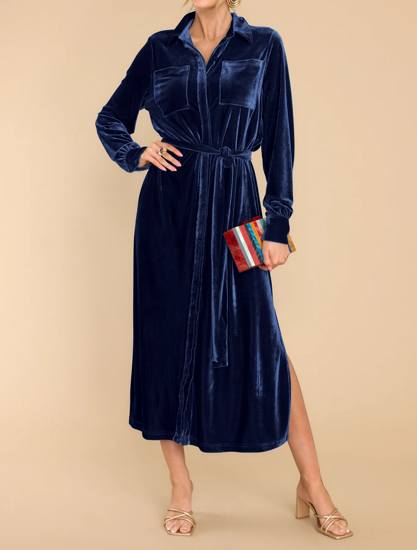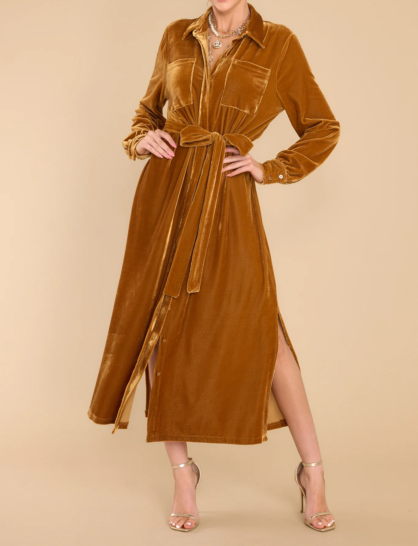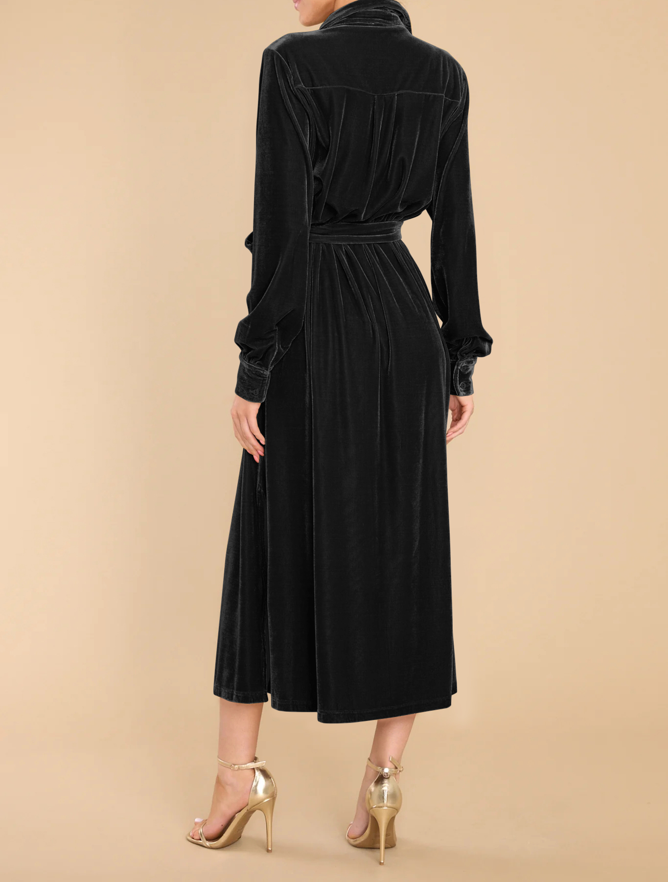 R.Vivimos Women's Fall Long Sleeve Velvet Casual Dresses Button Down Loose Slit Shirt Midi Dress with Belt 9