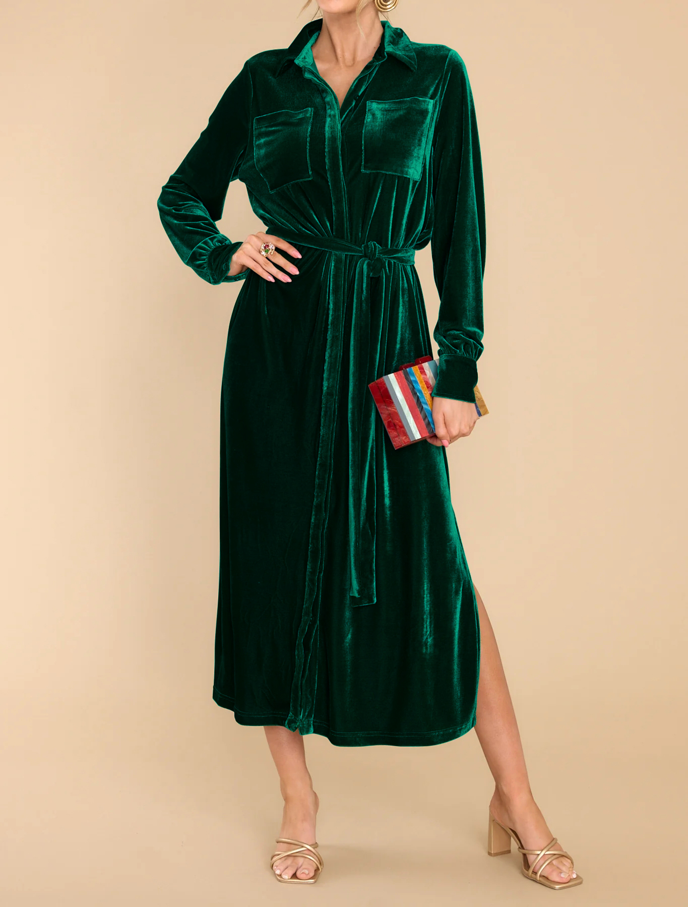 R.Vivimos Women's Fall Long Sleeve Velvet Casual Dresses Button Down Loose Slit Shirt Midi Dress with Belt 5