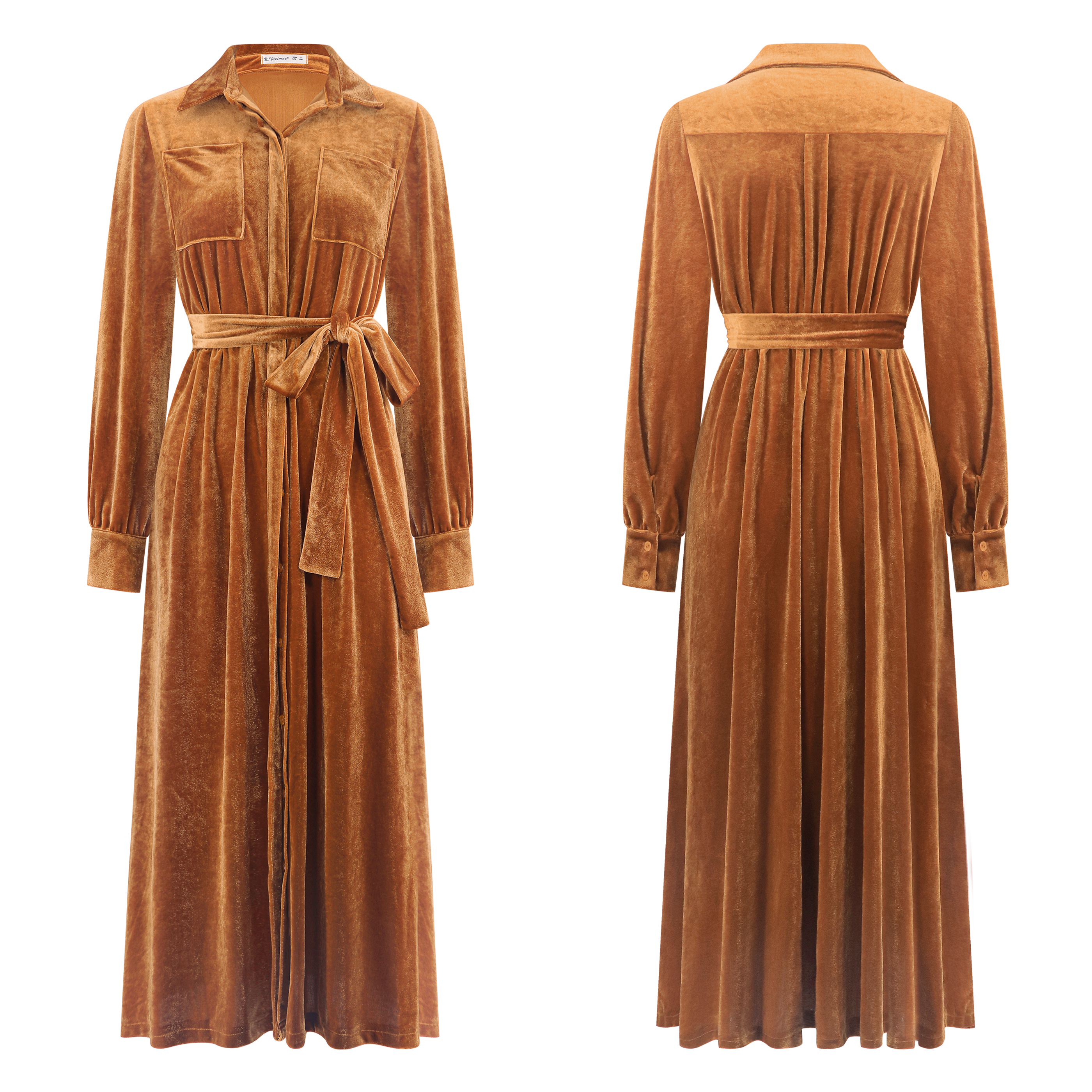 R.Vivimos Women's Fall Long Sleeve Velvet Casual Dresses Button Down Loose Slit Shirt Midi Dress with Belt 1