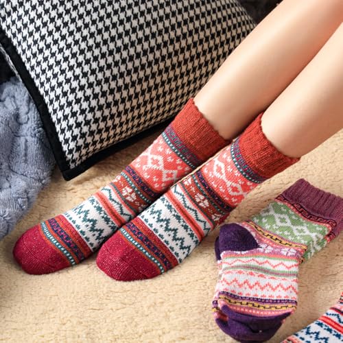 Fabric type: 35% Soft Wool, 16% Spandex, 49% PolyesterCare instructions: Machine WashOrigin: ImportedPattern: 5 Pairs Plus,5-9🐑Material - Womens winter warm socks made of excellent wool material. These cabin socks are super soft, breathable and wearable. Elegant, retro wool socks hosiery, colorful and comfy. The style and quantity are consistent with the picture (5 pairs each pack).🐑Size - Our wool socks women are free size 22.5 to 25 cm, suitable for women US shoe size 5 to 9, the women socks are elastic and perfectly make it suitable for your feet. Warm socks are not so thick that they won't fit in shoes but not too thin as to be cheap, that is pretty and so comfy.🐑Design - Vintage and trendy design warm socks for women that will coordinate with whatever you're wearing. Brighten up those cold winter mornings with these wool cozy socks to keep your toes warm. Vintage socks are good matching for all your sneakers, boots, snow boots, and sport shoes.🐑Warm Wool Socks - Designed for extreme weather conditions, great cold weather gear for outdoor activities and sports like skiing. Terry-loop="loop" cushioning throughout the entire foot, making the socks suitable for hiking, mountaineering, outdoor camping, cycling and longtime outdoor work. Even after repeated cleaning, this kind of woolen socks can also provide personal shape and warm function.🐑Excellent Ideas - A mix of bright prints makes these colorful winter socks women cool and fun. Womens wool socks can as stocking stuffers presents for women, mom, grandma, wife, sister, girlfriend. As a birthdays, christmas, thanksgiving, fall suprises. Come with 5 pairs knit socks, various colors of womens socks can easily follow your daily collocation. Perfect for everyday use. High quality materials and excellent craftsmanship ensure long-lasting durability.