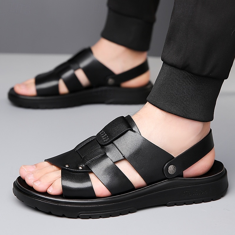 HOT ! Men's Black Faux Leather Sandals - Open-Toe Summer Footwear with Cross-Strap Design and Comfortable Sole for Casual Outdoor Wear
