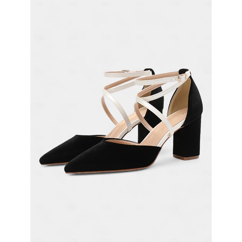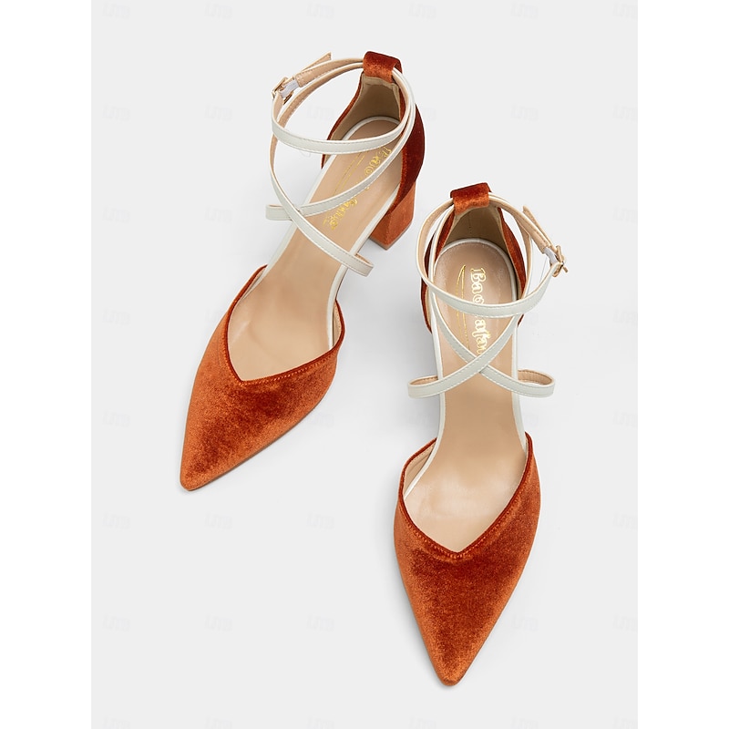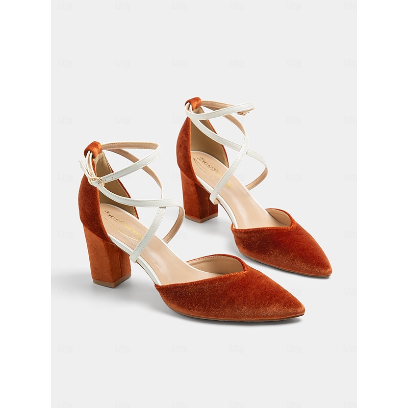 Highlights [Fabric] : Crafted from luxurious velvet in a rich rust hue, these shoes provide both warmth and elegance, making them a versatile addition to any wardrobe. The velvet upper is complemented by a synthetic leather lining, ensuring comfort and durability across all seasons. [Silhouette] : Featuring pointed toes, these ankle strap heels lend a sleek and sophisticated silhouette, perfect for adding a touch of refinement to both office and evening ensembles. The block heels offer stability and a comfortable height, making them suitable for extended wear. [Design Highlights] : The chic two-tone design of burnt orange and cream is accented by fashionable white crisscross ankle straps, adding a stylish and secure fit. The lace-up closure enhances the modern aesthetic while providing additional ankle support. [Occasions] : Ideal for daily wear, these heels transition seamlessly from the office to evening outings. Pair them with tailored pants for a polished business look or with dresses for a chic night out. Their versatile style makes them an excellent choice for a variety of occasions, from professional settings to social events. [Size Notice] : Available in a range of sizes from US5 to US13, these heels cater to a wide array of foot sizes. The standard sizing recommendation ensures that you can select your usual size for a perfectly tailored fit.