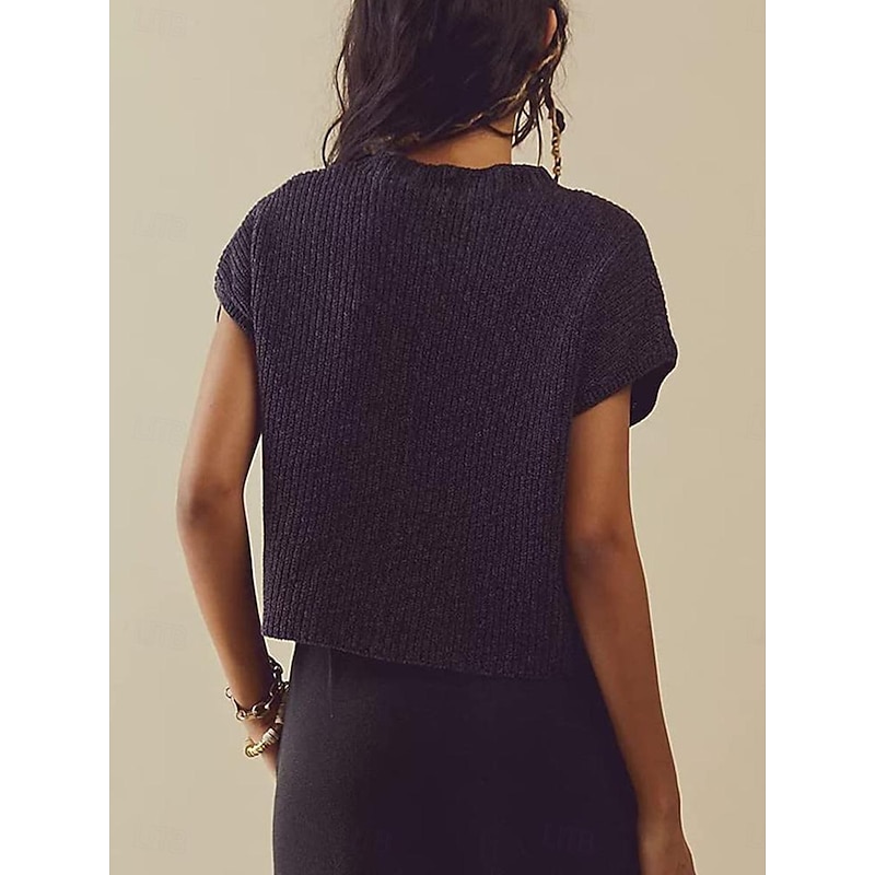 HOT ! Women's Sweater Vest Elegant Casual Solid Color Ribbed Turtleneck Pocket Short Sleeves Regular Tops Knit Work Black Army Green Summer