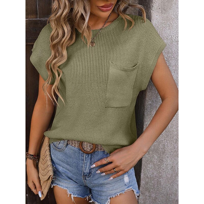 More information about Women's Sweater Vest Elegant Casual Solid Color Ribbed Turtleneck Pocket Short Sleeves Regular Tops Knit Work Black Army Green Summer