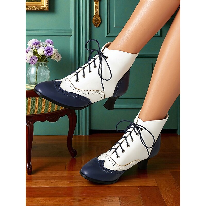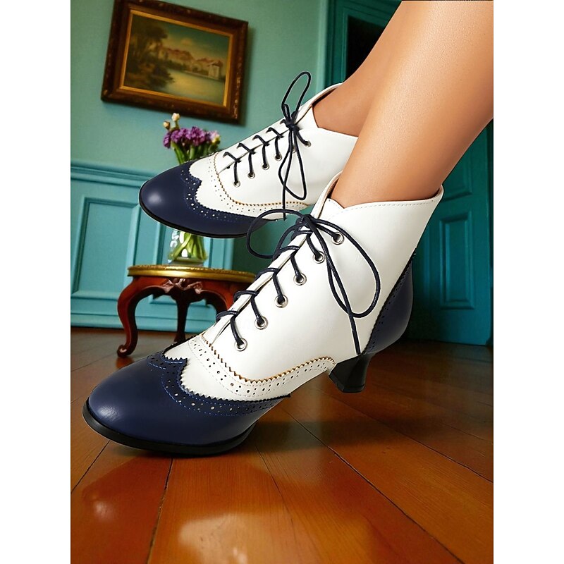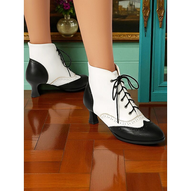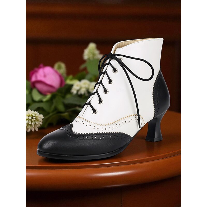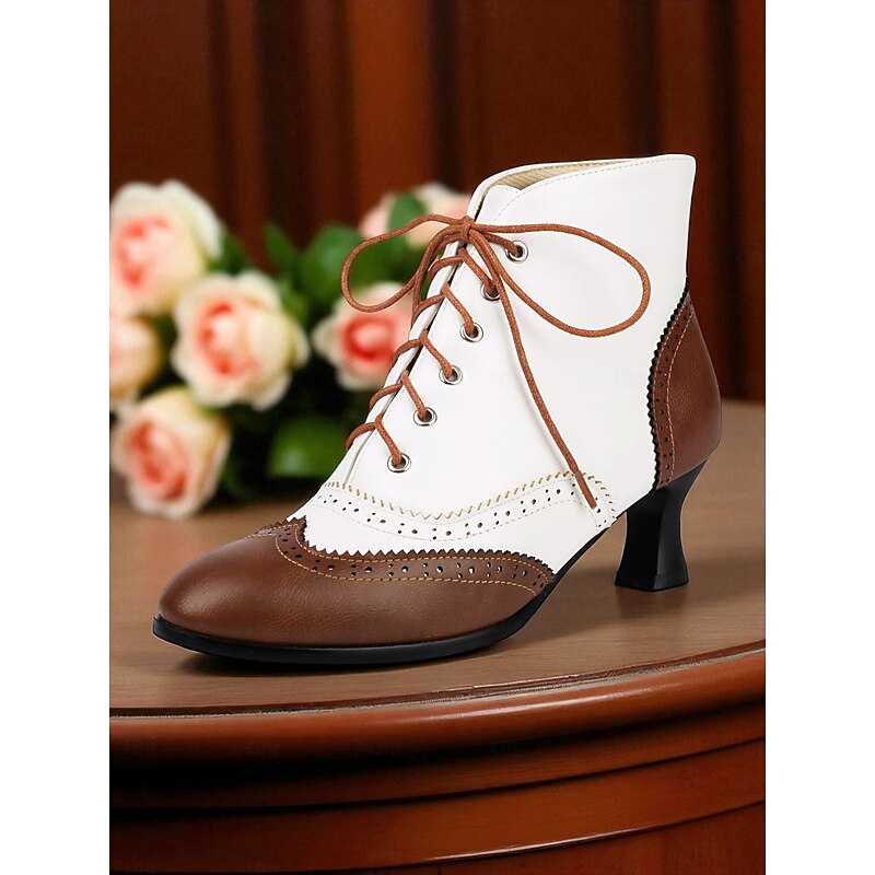 Women's 1950s Vintage Oxford Ankle Boots – Two-Tone Lace-Up Brogue Heels with Wingtip Design, Edwardian Style for Retro Outfits, Cosplay, Tea Parties and Daily Wear 1