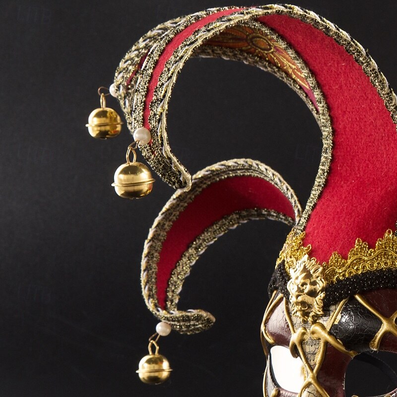 Highlights [Fabric] This opulent Venetian mask is crafted from luxurious materials, featuring an exquisite satin or velvet overlay that enhances its sophisticated texture and rich, vibrant color. The durable plastic base ensures a lightweight yet sturdy structure, perfect for extended wear during festivities. [Design Highlights] The mask boasts an intricate porcelain facade with a charming crackle effect, adorned with a dramatic arrangement of jester-inspired extensions, each tipped with golden bells for a playful touch. Its lattice pattern and gold accents contribute to a regal and elegant aesthetic, making it a standout piece in any collection. [Occasions] Ideal for masquerade balls, theatrical performances, Halloween festivities, and other festive gatherings, this mask adds a touch of intrigue and glamour to any event. Its dramatic appearance makes it an excellent choice for making a bold impression at Carnival of Venice or Mardi Gras celebrations. [Style] The full-face design seamlessly blends with the vibrant blue and gold color palette, creating a mesmerizing visual impact. Its classic Venetian style is suitable for both costume purposes and as a decorative masterpiece for collectors. [Size] Offered in a convenient one-size option, this mask is designed to fit comfortably on most adults, ensuring a secure fit throughout any event, allowing for prolonged enjoyment without sacrificing comfort.