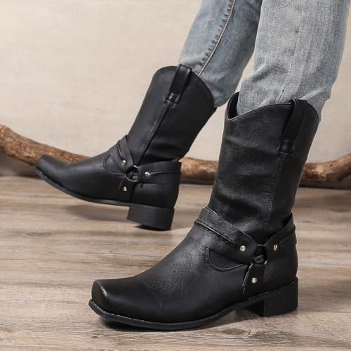 yamerbo Men's Western Cowboy Boots Square Toe Leather Cowboy Boots traditional Retro Pull-On Mid-Calf Biker Work Boots for Men