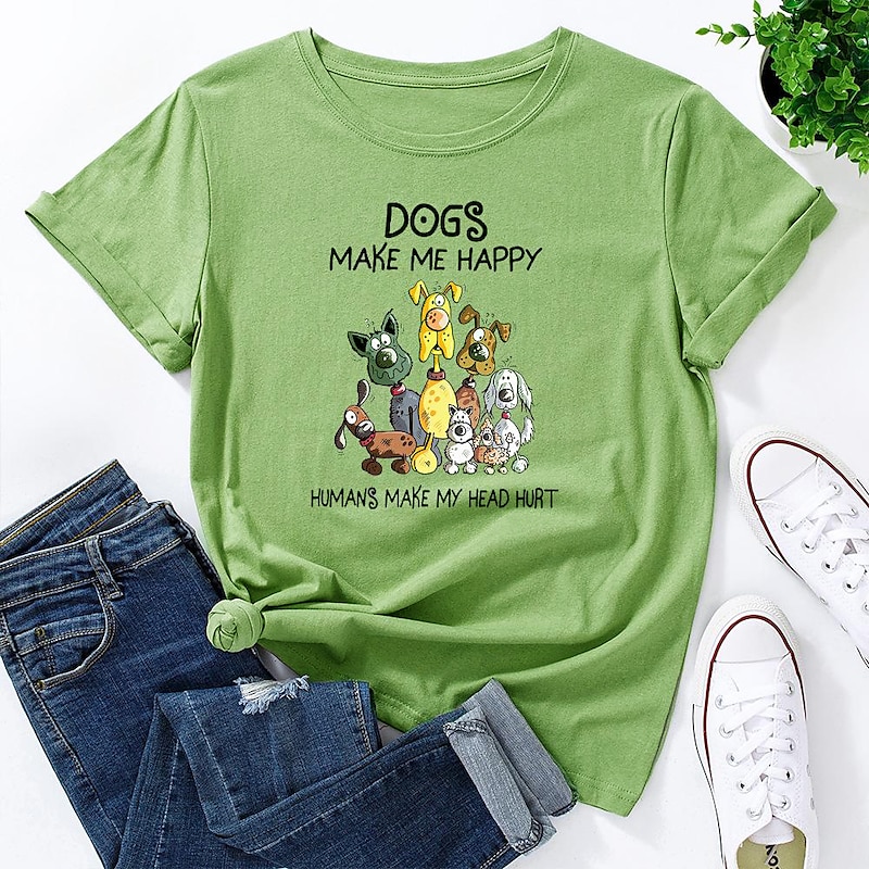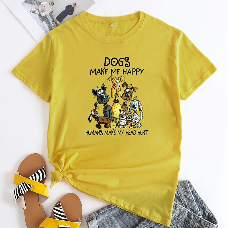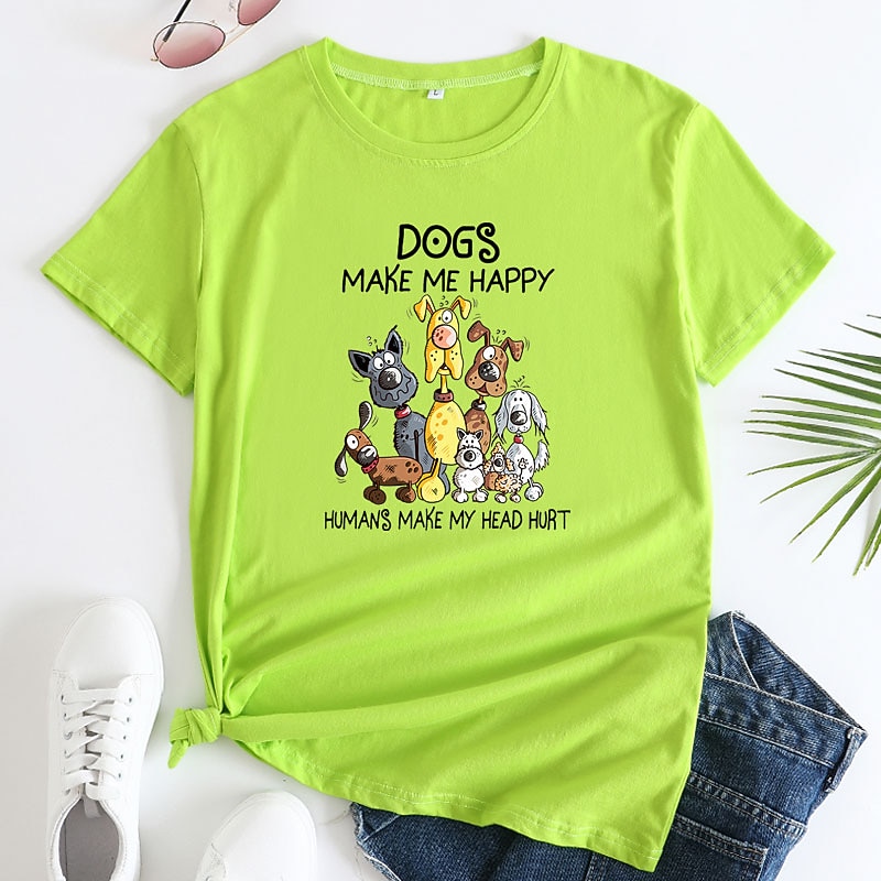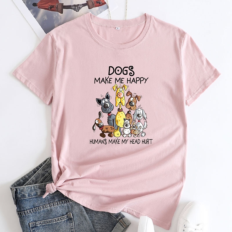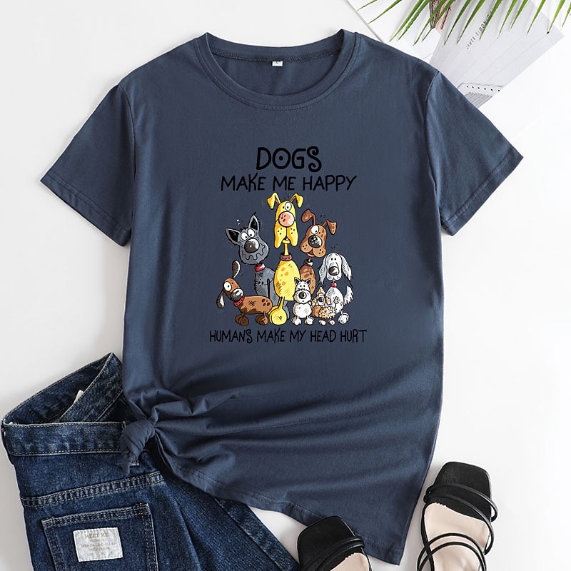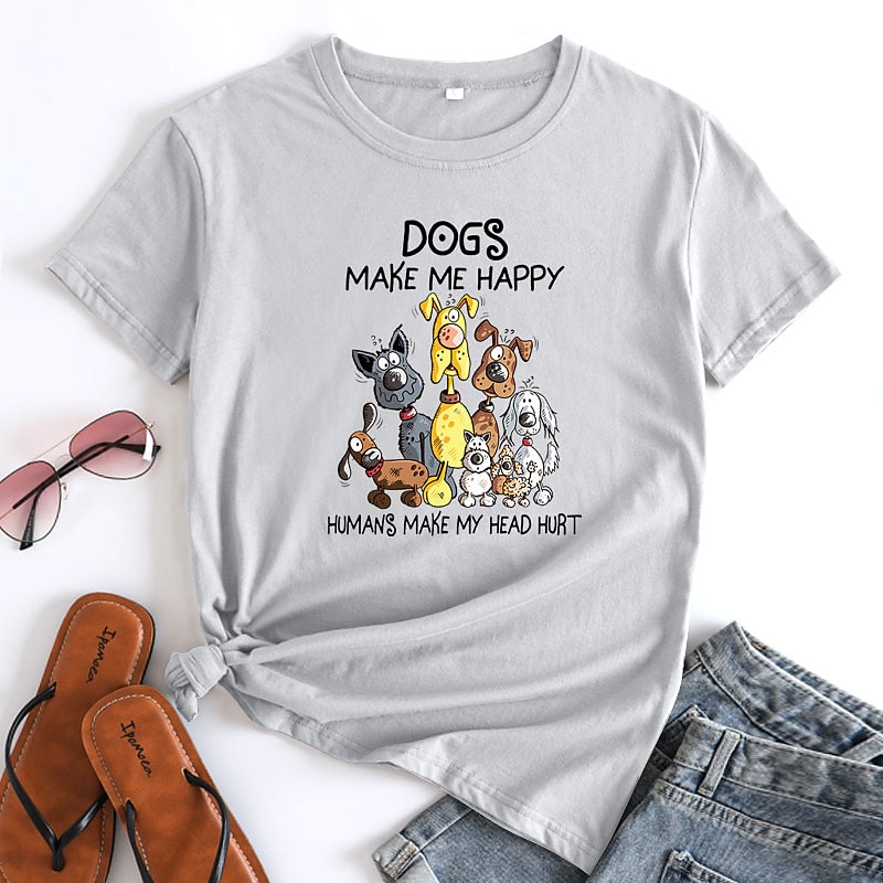 : The front of the t-shirt features a playful dog-themed graphic, displaying a group of cartoon dogs in vibrant colors, along with the humorous text, "Dogs make me happy, humans make my head hurt." This design element adds a touch of personality and fun, allowing you to express your love for dogs in a stylish way.