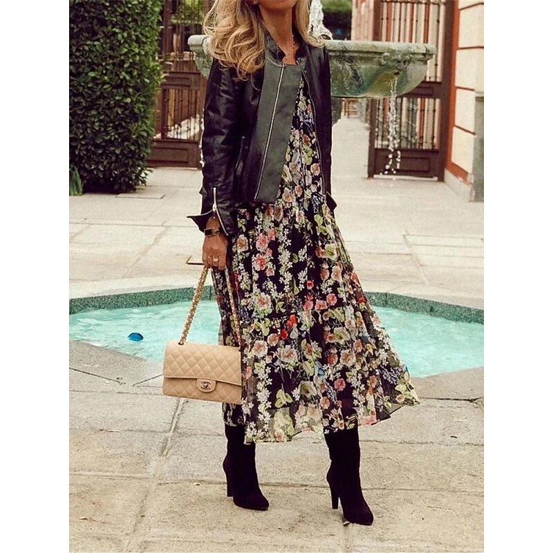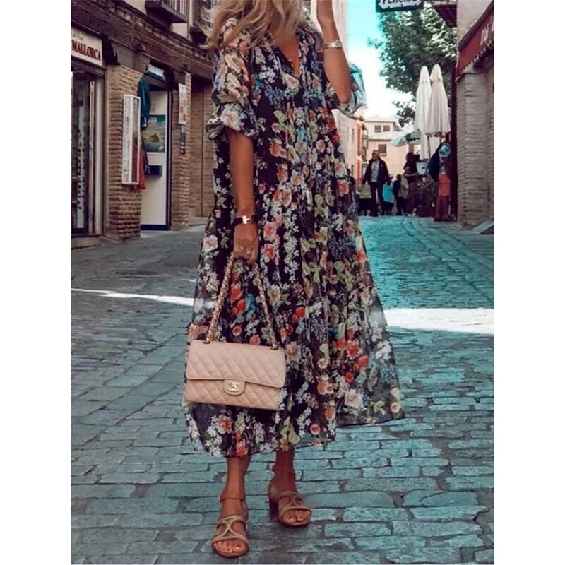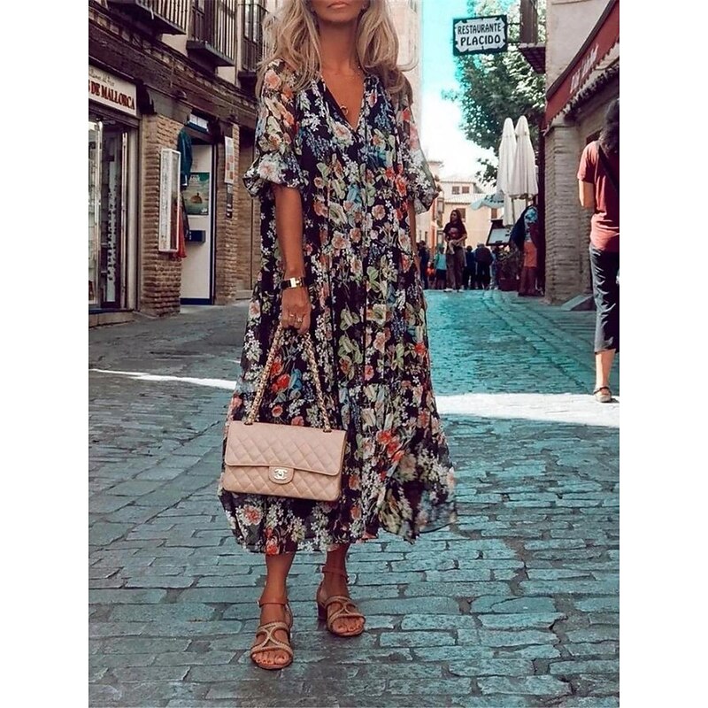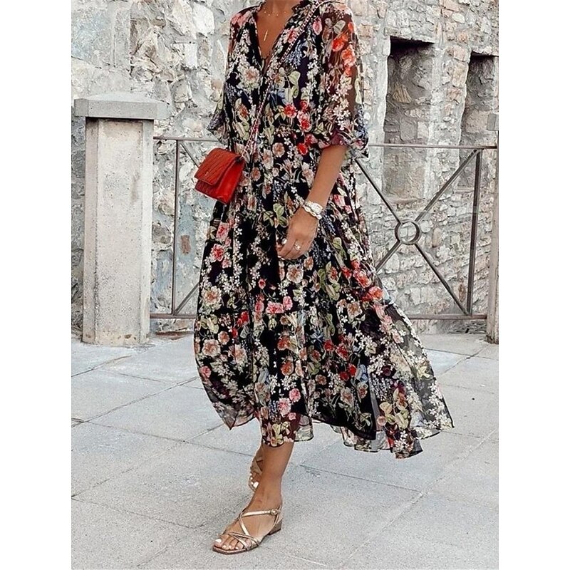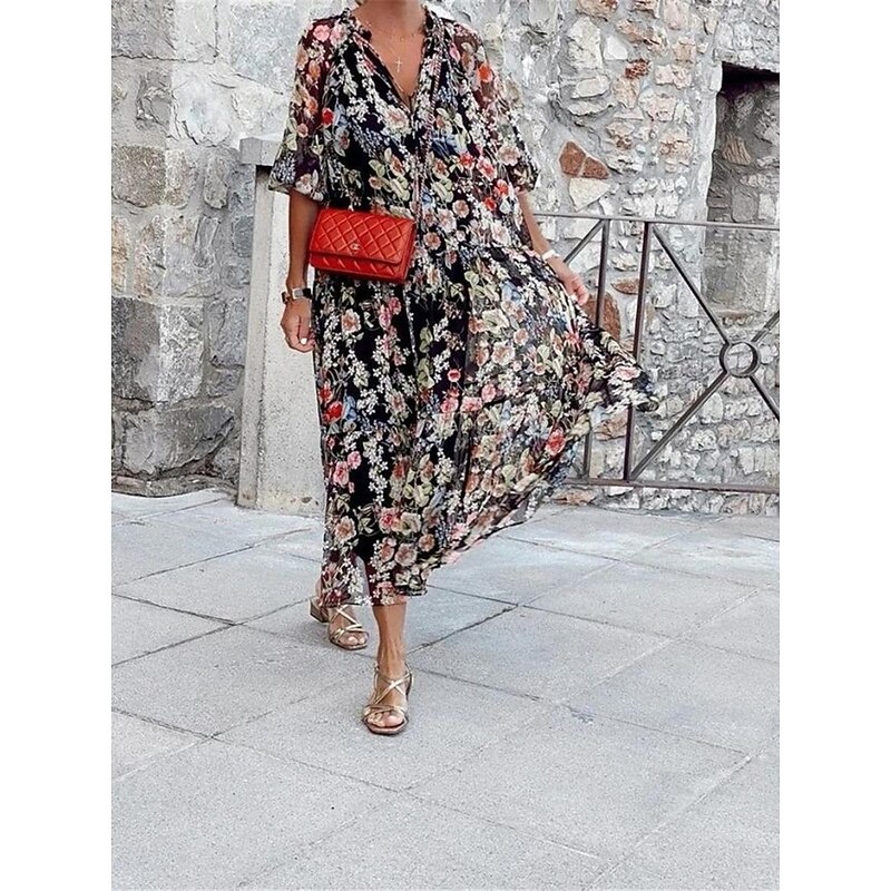 Highlights [Fabric]: Crafted from lightweight and breathable polyester, this dress offers a micro-elastic fit that ensures ease of movement and all-day comfort. The fabric is ideal for warm weather, promoting a cool and relaxed feel. [Fit]: The dress boasts a loose, flowing silhouette designed to fall gracefully to a midi length. Its relaxed fit is complemented by wide, half sleeves, adding to the dress's overall bohemian charm. [Design Highlights]: Featuring an all-over floral print set against a dark background, this dress captures attention with its vibrant contrast. The V-neckline adds a touch of femininity, while the bohemian-inspired design enhances its casual elegance. [Occasions]: Perfect for vacations, street outings, and holiday celebrations, this dress is ideal for those who appreciate a blend of comfort and style. It's the perfect choice for a casual stroll on a sunny day or any warm-weather event. [Size Range]: Available in sizes S, M, L, XL, and 2XL, this dress offers a range of options to ensure the perfect fit for various body types.