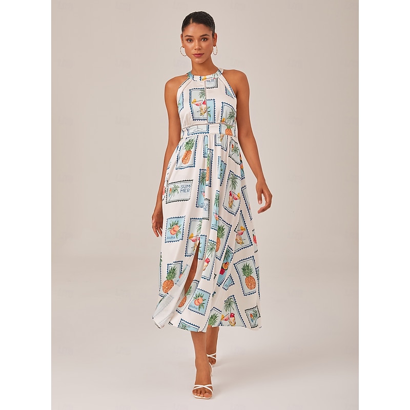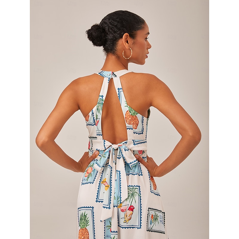 Highlights - Perfect for summer vacations and daily wear - Sleeveless design for a comfortable fit - High waistline for a flattering silhouette - Casual dress with lace, backless, and print design details - Features a stylish halter neck and tie back - Maxi dress length for a chic look