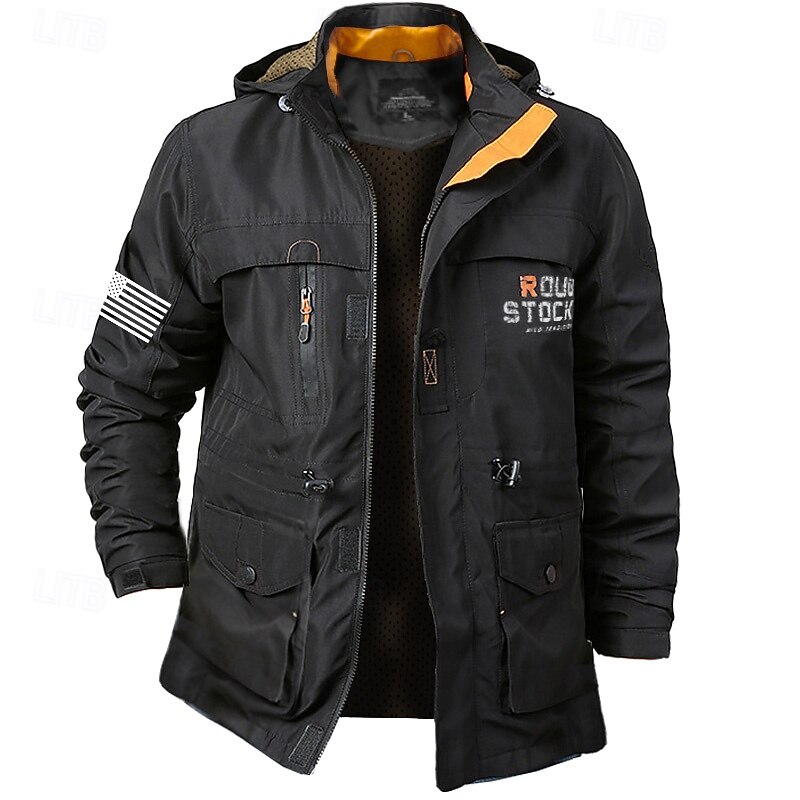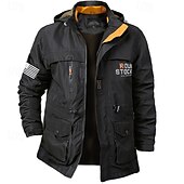 : Featuring a tactical, military-inspired design, this jacket includes a full-length zip front for easy wear, a standing collar for added protection, and an adjustable drawstring hood. The multiple pockets—two large front flap pockets and additional chest zip pockets—offer practical storage options. The graphic design, highlighted by an American US flag pattern and a printed emblem, adds a distinctive visual appeal.