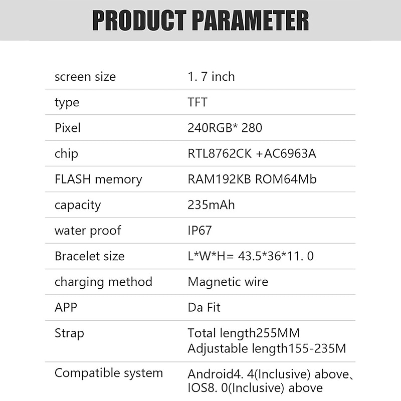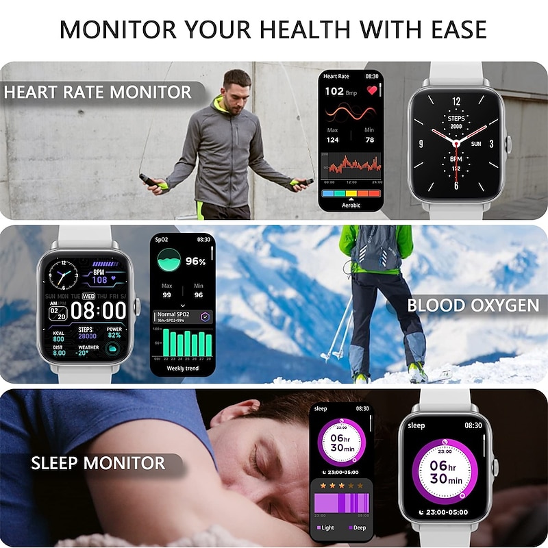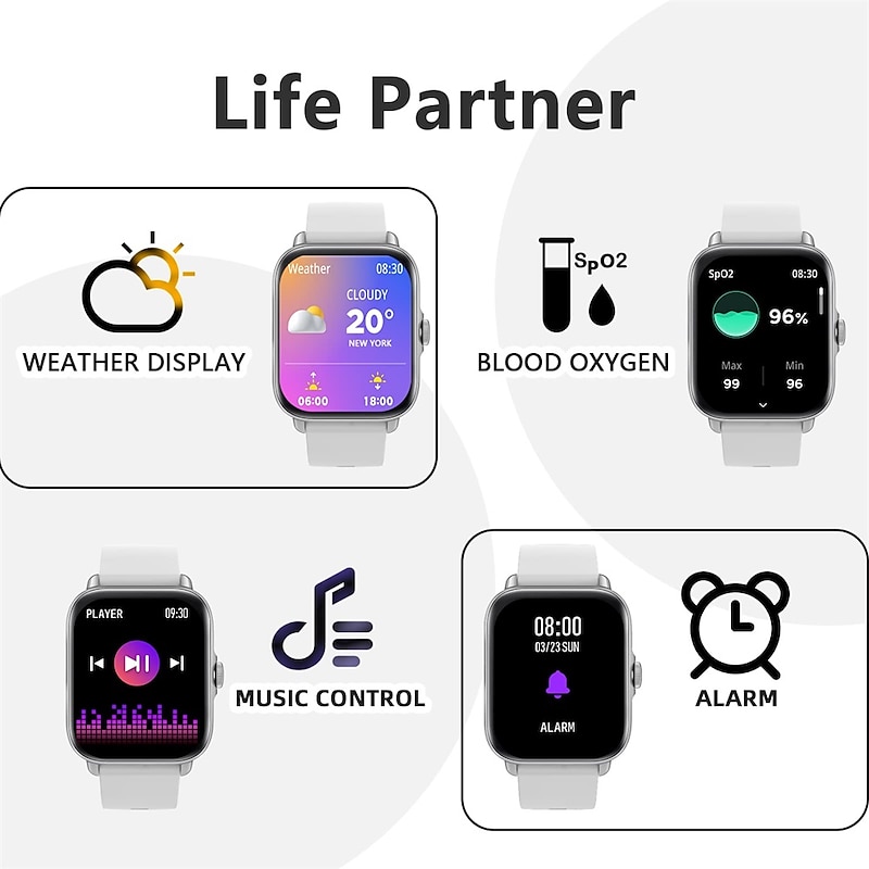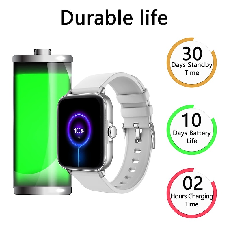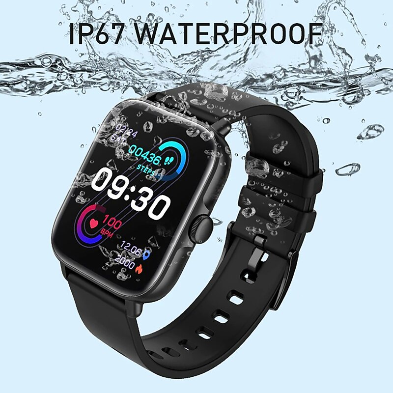 Highlights 1. Stay Connected on the Go: With Bluetooth call and smart notification feature, you can make and answer calls directly from your smart watch, and receive messages from multiple apps, so you never miss important information. 2. Track Your Health on the Go: The fitness watch continuously monitors your daily activity including steps, distance, calorie consumption, heart rate, sleep time and blood oxygen levels, allowing you to track and analyze your health and fitness data with ease. 3. A Companion for Every Adventure: Featuring 28 sport modes such as swimming, running, climbing, yoga, this watch is designed to keep up with your active lifestyle. In addition to sports tracking, this watch also acts as an assistant providing features such as music and camera control, weather display, sedentary reminder, drink water reminder, alarm clock, stopwatch, flashlight, and find phone. 4. Stunning Display and Personalized Style: The high texture metal watch frame with the 1.7" TFT full touch colorful screen enhances both appearance and usability. It comes with over 150+ customizable watch faces that you can choose to match your style or add your photos to create a personalized touch. 5. Long Battery Life and Waterproof Design: With IP67 waterproof rating, the smart watch is perfect for everyday use and can withstand splashes and unexpected spills. The durable 235mAH battery can be fully charged in about 2 hours and provides up to 2 days of battery life with Bluetooth calls and a standby time of 30 days. Compatible with both IOS 9.0 and Android 4.4 and above devices.