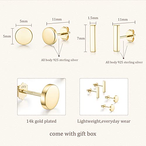 • You Must Have: 2 Pairs gold bar dot stud earrings set. Made from 925 sterling silver and plated with the durable 14K gold and high polished, shiny finish. Simple and dainty design ideal match for any outfits. These tiny gold stud earrings are minimalist, trendy style comefortable for every day wear.